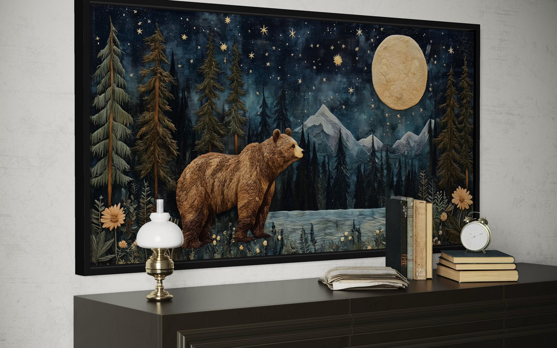 Cette décoration murale représentant un ours dans la forêt nocturne est idéale pour un salon rustique de chalet ou un refuge de style chalet où les images inspirées par la nature s'harmonisent avec les matériaux naturels chaleureux. Installée au-dessus d'un canapé, d'une cheminée ou d'une console en bois, la toile imprimée devient un point focal saisissant, reflétant l'esthétique sauvage environnante souvent présente dans les intérieurs de chalets. Dans une pièce de style chalet avec poutres apparentes, meubles en cuir et tissus texturés, la scène de forêt au clair de lune se fond naturellement dans l'environnement rustique. La composition horizontale s'étend sur le mur comme une fenêtre ouverte sur la nature, agrandissant visuellement l'espace. La lune brillante diffuse une douce lumière dans l'œuvre d'art, équilibrant les tons plus sombres des meubles et du bois souvent utilisés dans la décoration des chalets. Dès leur entrée dans la pièce, les invités remarquent l'ours traversant la forêt, créant une impression de présence sauvage et paisible. Les intérieurs à thème nature bénéficient d'œuvres d'art représentant la faune et les paysages montagneux. Cette scène renforce l'atmosphère paisible associée aux chalets isolés et aux retraites en forêt. Un intérieur rustique et chaleureux, inspiré par les montagnes et la faune, est magnifiquement complété par cette toile murale représentant un ours dans la forêt nocturne.