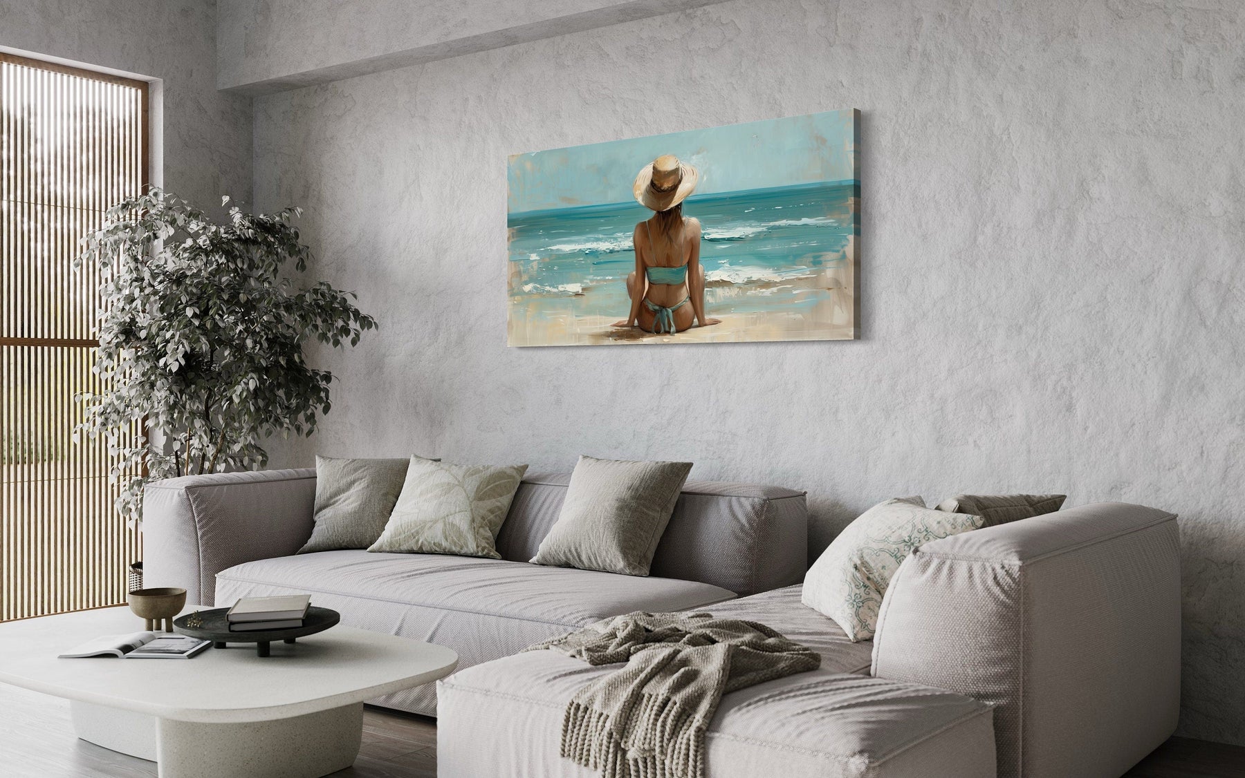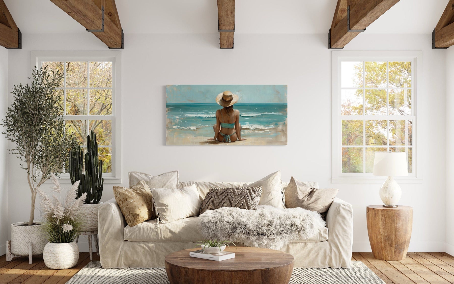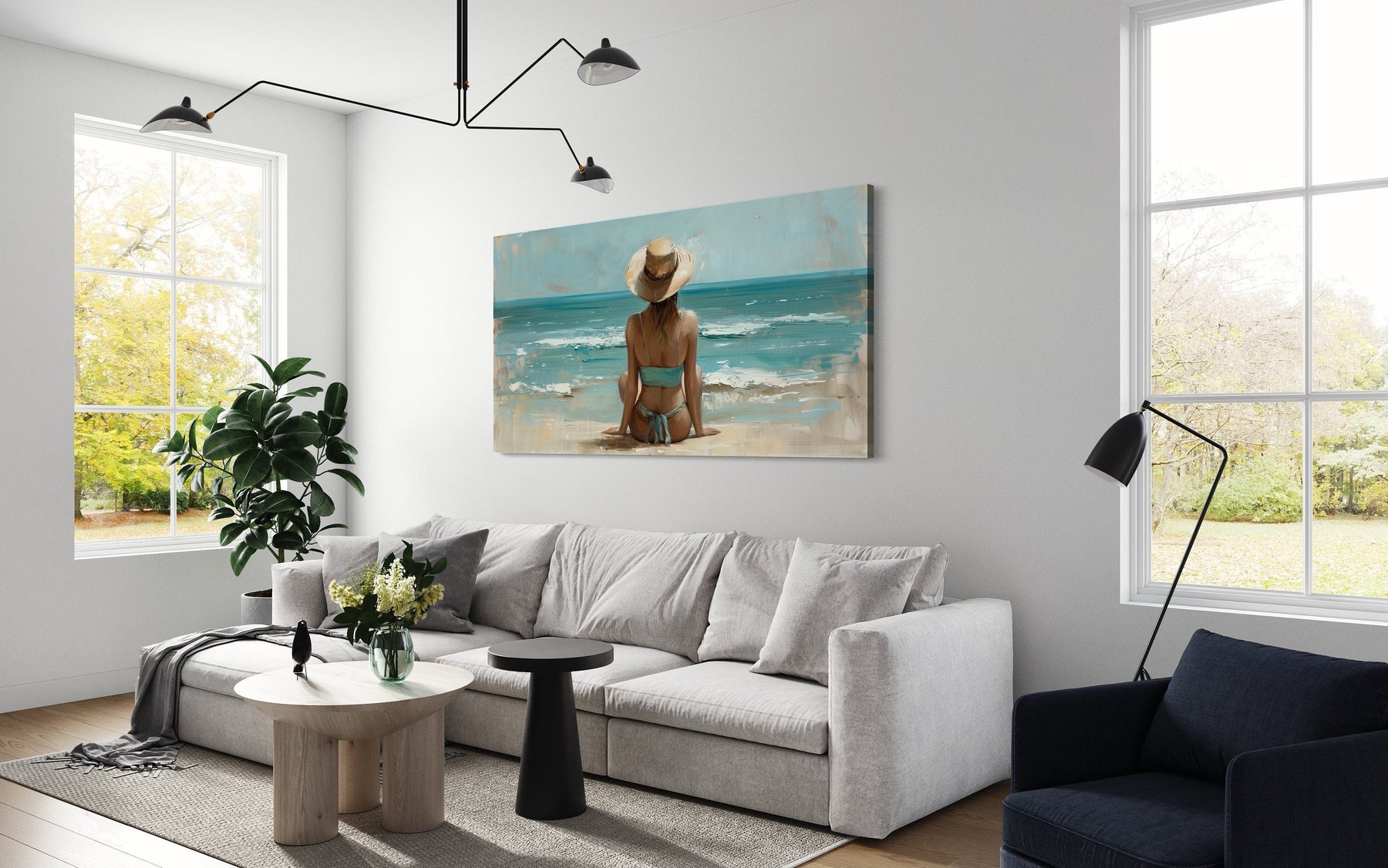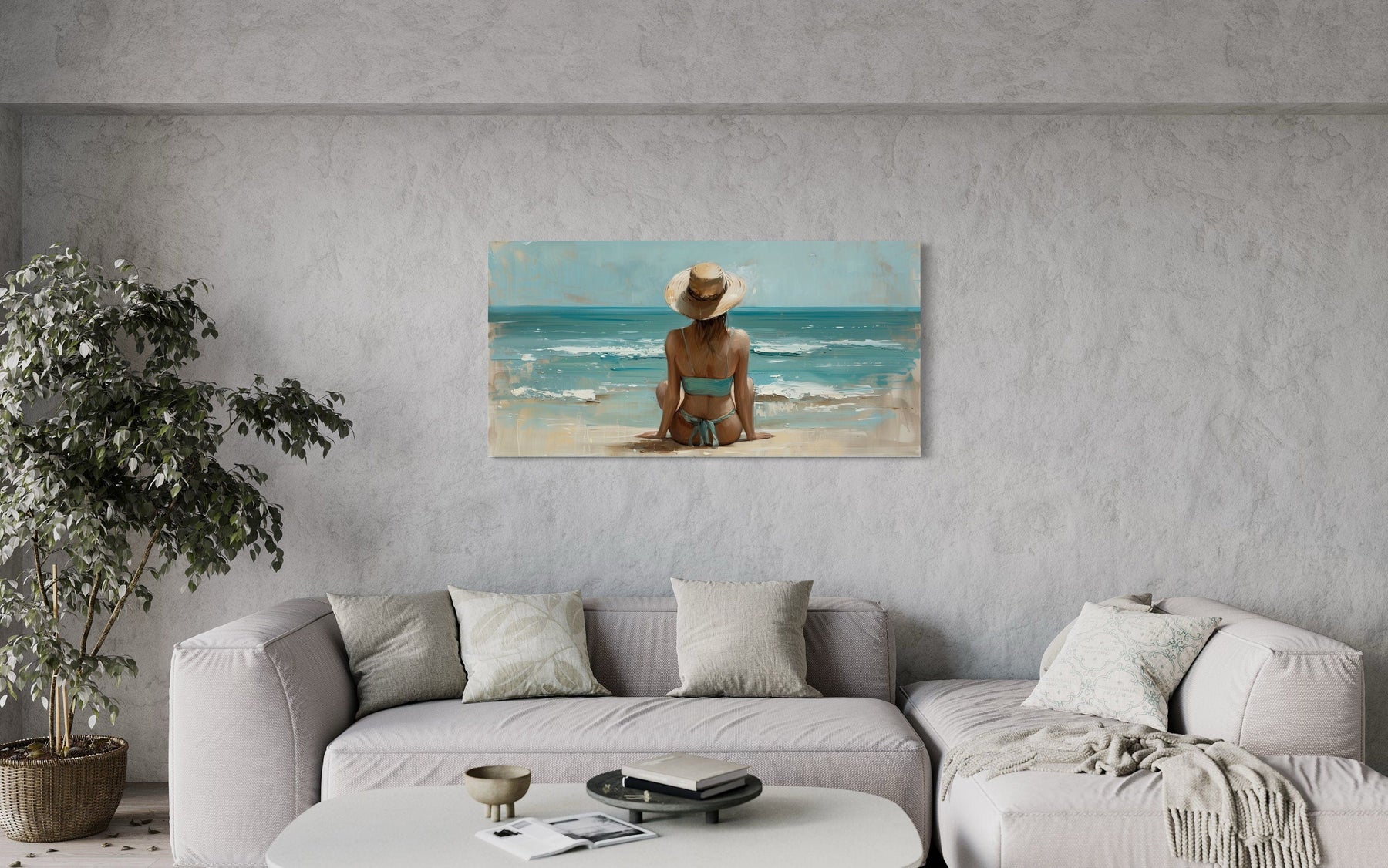 Tableau mural femme plage - Impression sur toile encadrée style côtier avec chapeau à larges bords