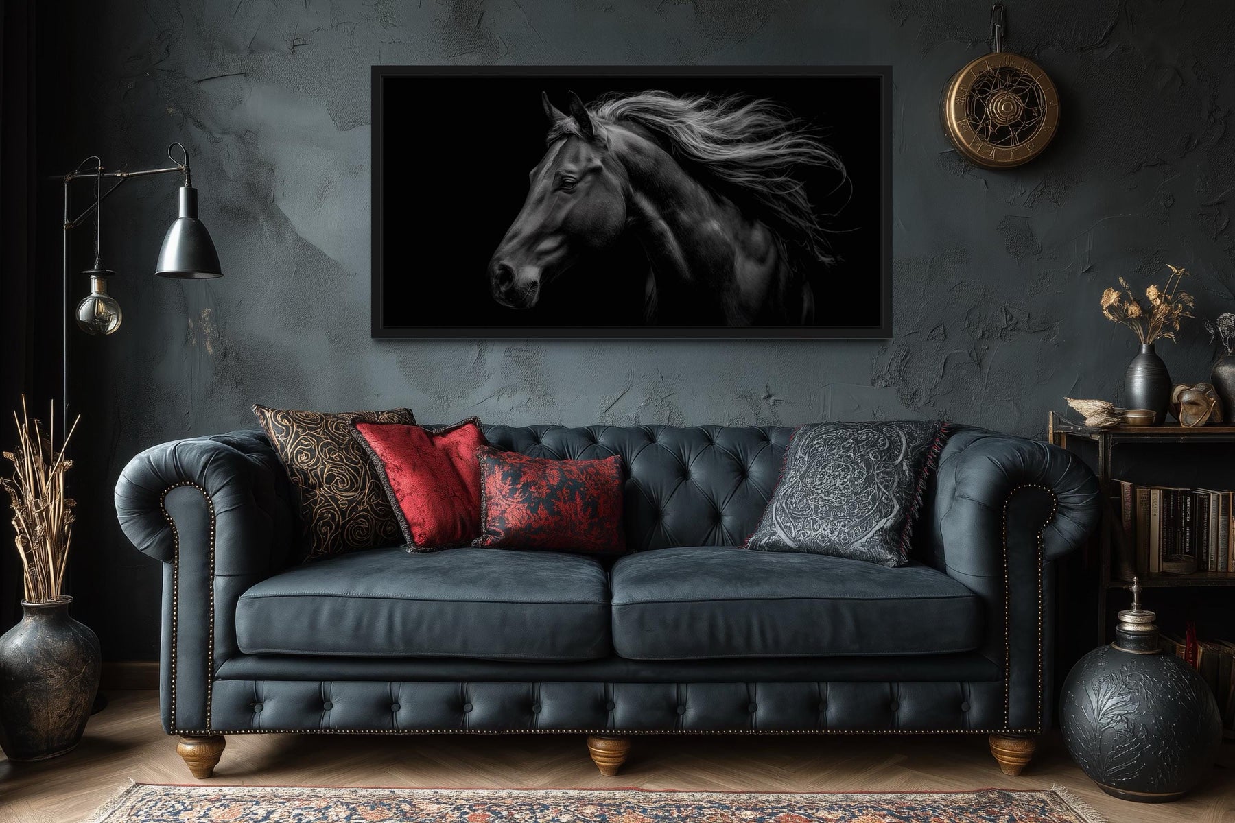 Ce tableau sur toile représentant un cheval est conçu pour les intérieurs qui célèbrent la force, le minimalisme et le luxe discret. Il s'épanouit dans les espaces masculins tels que les bureaux de cadres, les caves à vin ou les salons modernes, où ses tons dramatiques apportent équilibre et distinction. Pour les maisons contemporaines aux lignes épurées et aux palettes neutres, il ajoute la touche parfaite d'audace raffinée sans encombrer le flux visuel. Dans les environnements rustiques ou industriels, les tons sombres s'harmonisent magnifiquement avec les meubles en cuir, les accents métalliques et les textures en bois, créant un aspect cohérent qui semble intentionnel et équilibré. Le grand format encadré le rend idéal pour les murs de caractère, où il attire l'attention tout en conservant le calme grâce à sa simplicité tonale. Il convient aussi bien aux lofts urbains qu'aux lodges de campagne, alliant force et grâce d'une manière qui plaît à tous les styles. Dans les espaces minimalistes, il fonctionne comme un point focal unique – une incarnation du calme et du pouvoir dans une seule image. Ses proportions équilibrées et son exécution élégante garantissent qu'il rehausse plutôt que de dominer son environnement. Qu'il soit exposé au-dessus d'une cheminée, dans une salle à manger ou comme pièce de galerie, il dégage confiance, discipline et goût intemporel. Puissant dans sa présence mais discret dans son ton, ce tableau noir représentant un cheval définit la beauté de la retenue et l'art de la force raffinée.