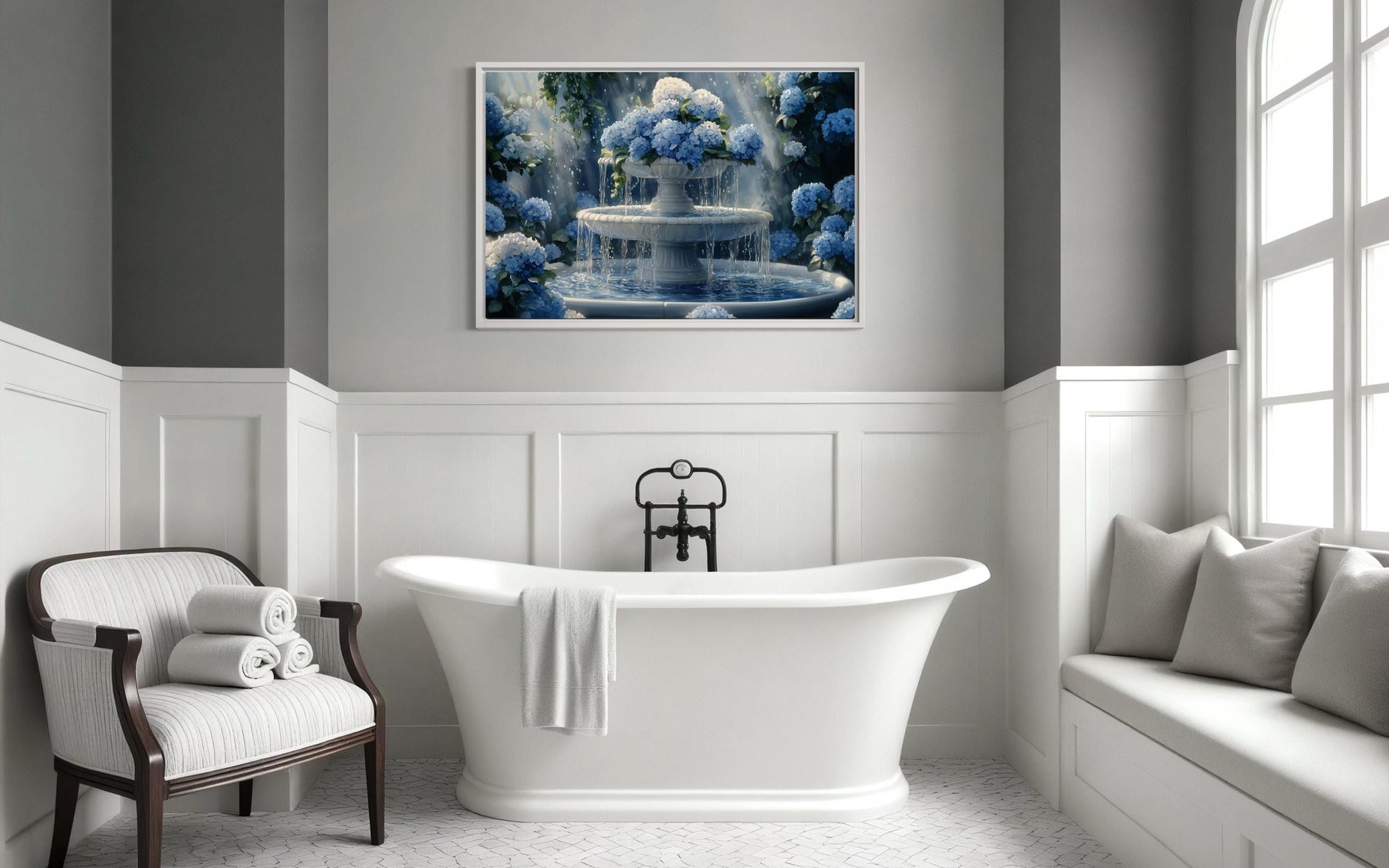 Le tableau « Fontaine aux fleurs bleues » pour salle de bain rayonne d'une palette élégante conçue pour rafraîchir le regard et apaiser l'esprit. Des couches de bleu ciel doux et de perce-neige délicat dominent les fleurs, tandis que des teintes de saphir plus profondes et de minuit créent des ombres naturelles et une profondeur spectaculaire. Des touches d'émeraude, de sauge et de turquoise brumeux atténués donnent vie au feuillage et aux reflets de l'eau, équilibrant parfaitement les tons froids et chauds. Des nuances subtiles de blanc perle et d'ivoire crémeux capturent l'éclat des jets de la fontaine et les reflets de la porcelaine, ajoutant un effet aérien et lumineux. Des accents argent pâle et gris brume complètent l'image, suggérant la lumière du matin filtrant à travers un léger brouillard. Ensemble, ces teintes créent une sensation d'eau en mouvement et d'une végétation luxuriante qui s'accorde aussi bien avec le marbre, la céramique et les finitions peintes. Que ce soit baigné de lumière naturelle ou éclairé par des appliques murales, ces couleurs restent vives et apaisantes, procurant une sensation constante de fraîcheur. Conçu pour maintenir son éclat et résister à l'humidité, ce tableau sur toile « Fontaine aux fleurs bleues » pour salle de bain conserve son atmosphère paisible et sa beauté durable pendant des années de plaisir quotidien.