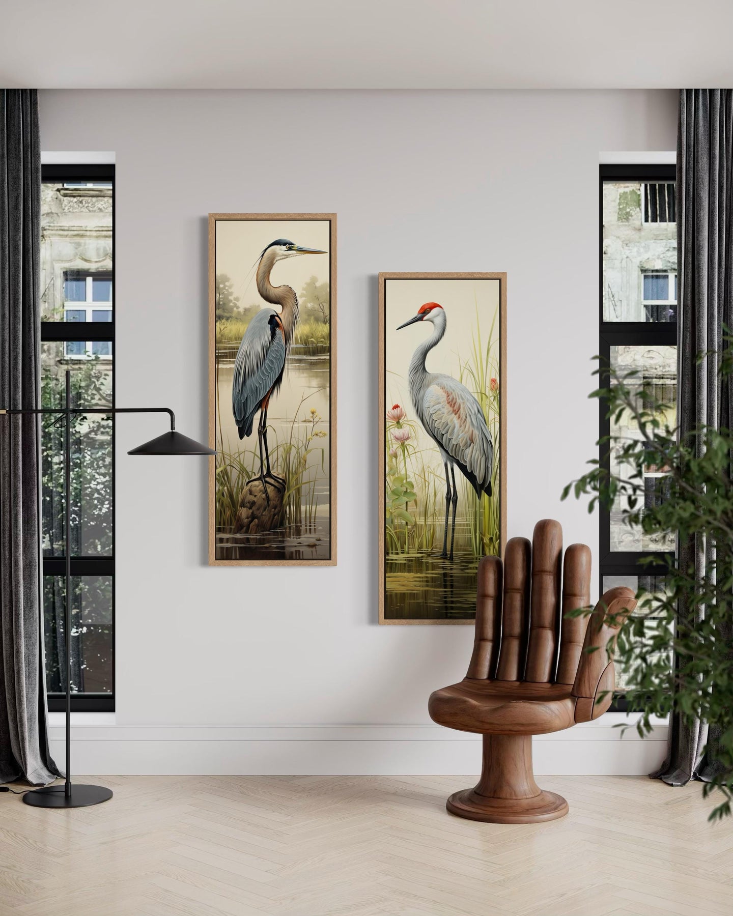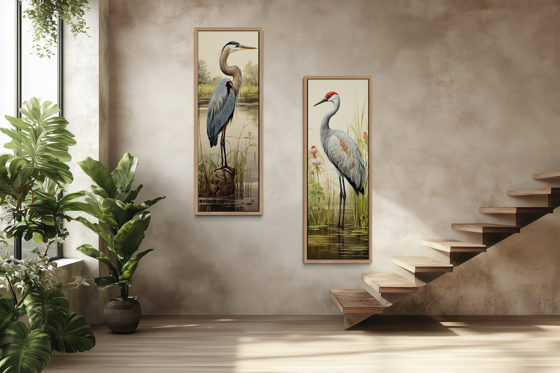 Aigrette bleue et Grue du Canada, verticales, lot de 2 toiles murales