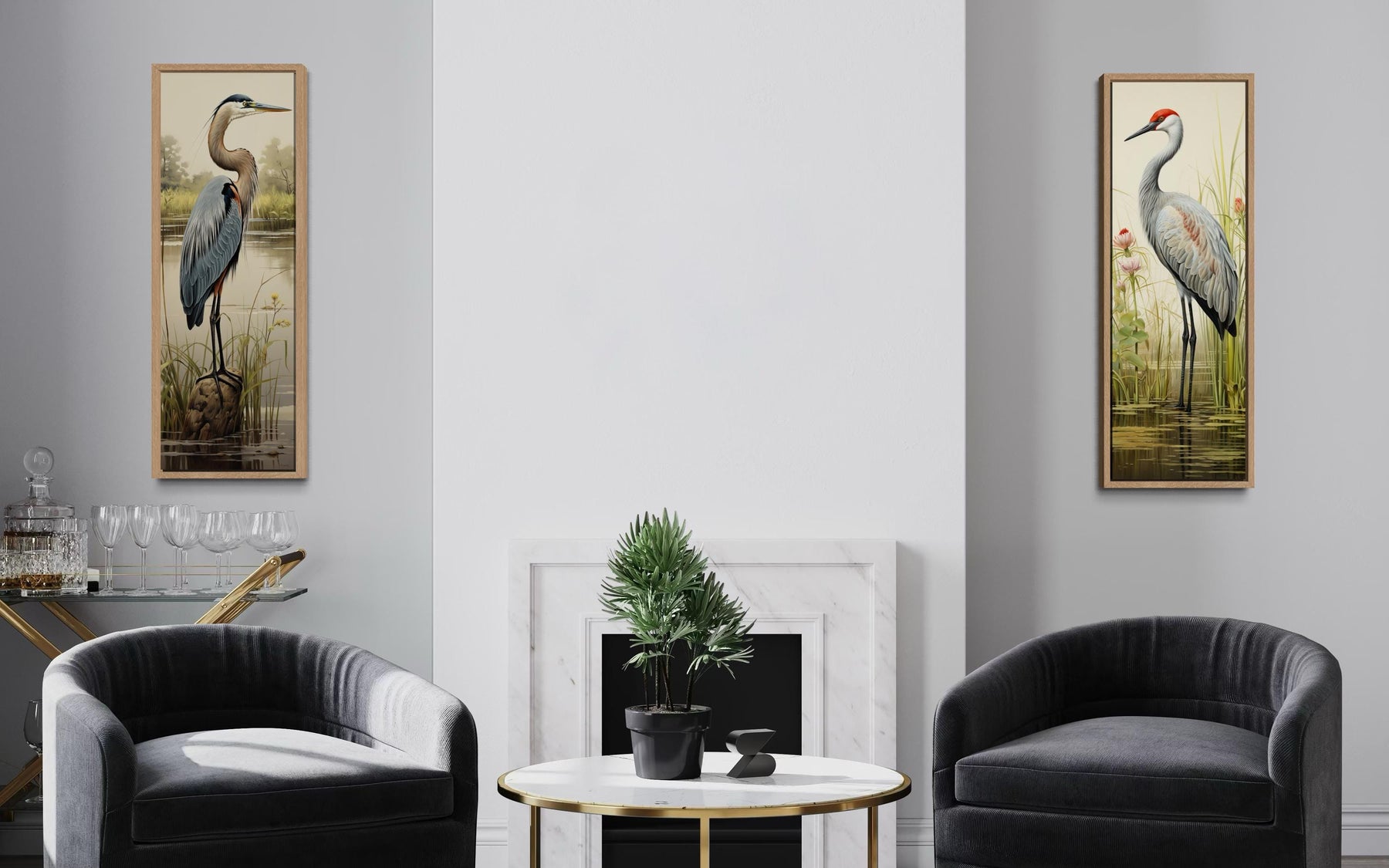 Cet ensemble a été créé pour la maison aimant la nature et l'intérieur de transition qui désire de l'art animalier avec une véritable profondeur botanique, une richesse écologique et le type de beauté naturelle stratifiée que les peintures d'oiseaux purement minimales sur fond blanc ne peuvent pas offrir. Un salon ou une chambre construits autour de neutres chauds, de textures naturelles, d'accents botaniques, de meubles en bois chaud et d'un amour profond du monde naturel trouveront dans cet art mural héron cendré et grue du Canada un diptyque qui parle son langage visuel avec une authenticité complète et une qualité artistique réelle — deux oiseaux magnifiques dans leurs habitats complets et vivants, peints avec le soin et l'attention que les vrais amoureux de la nature reconnaissent immédiatement et apprécient profondément. Le format à deux panneaux et la composition verticale haute rendent cet ensemble idéal pour encadrer une cheminée, une porte ou un grand meuble où deux verticales assorties créent une symétrie architecturale et un drame botanique à parts égales. Une véranda, un porche grillagé ou tout espace intérieur qui brouille la frontière entre l'intérieur et le monde naturel extérieur trouvera cet ensemble une addition complètement naturelle et profondément satisfaisante — les arrière-plans botaniques luxuriants apportant la sensation d'un marais vivant ou d'une zone humide directement dans la pièce. La maison de transition — celle qui mélange des éléments traditionnels et contemporains avec un amour des matériaux naturels et de l'extérieur — trouvera que cet ensemble relie ces mondes avec facilité, faisant référence à l'illustration classique d'histoire naturelle tout en se sentant complètement à l'aise dans un intérieur moderne et bien conçu. Une chambre principale avec des tons neutres chauds, des textures naturelles et des accents botaniques ou sur le thème de la nature trouvera que ce diptyque au-dessus d'une console ou encadrant le lit crée une atmosphère de véritable sanctuaire naturel — le genre de pièce qui semble exister en relation délibérée avec le monde vivant juste à l'extérieur de ses murs. Laissez cet ensemble de 2 toiles murales héron cendré et grue du Canada faire de votre maison l'espace magnifiquement sauvage, riche botaniquement et profondément réfléchi qu'il était toujours destiné à être.