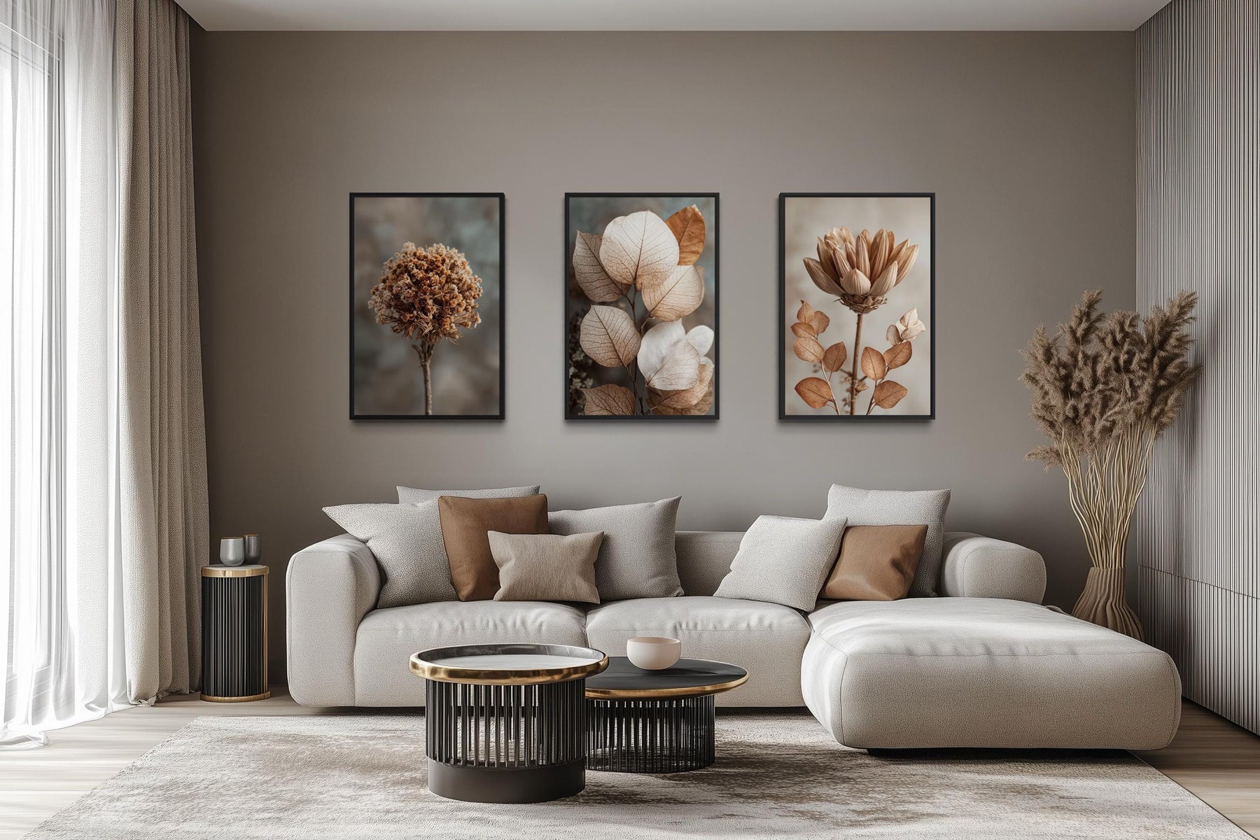 Ensemble de 3 affiches botaniques murales – Impressions de fleurs et de plantes séchées dans des tons neutres de beige et de brun