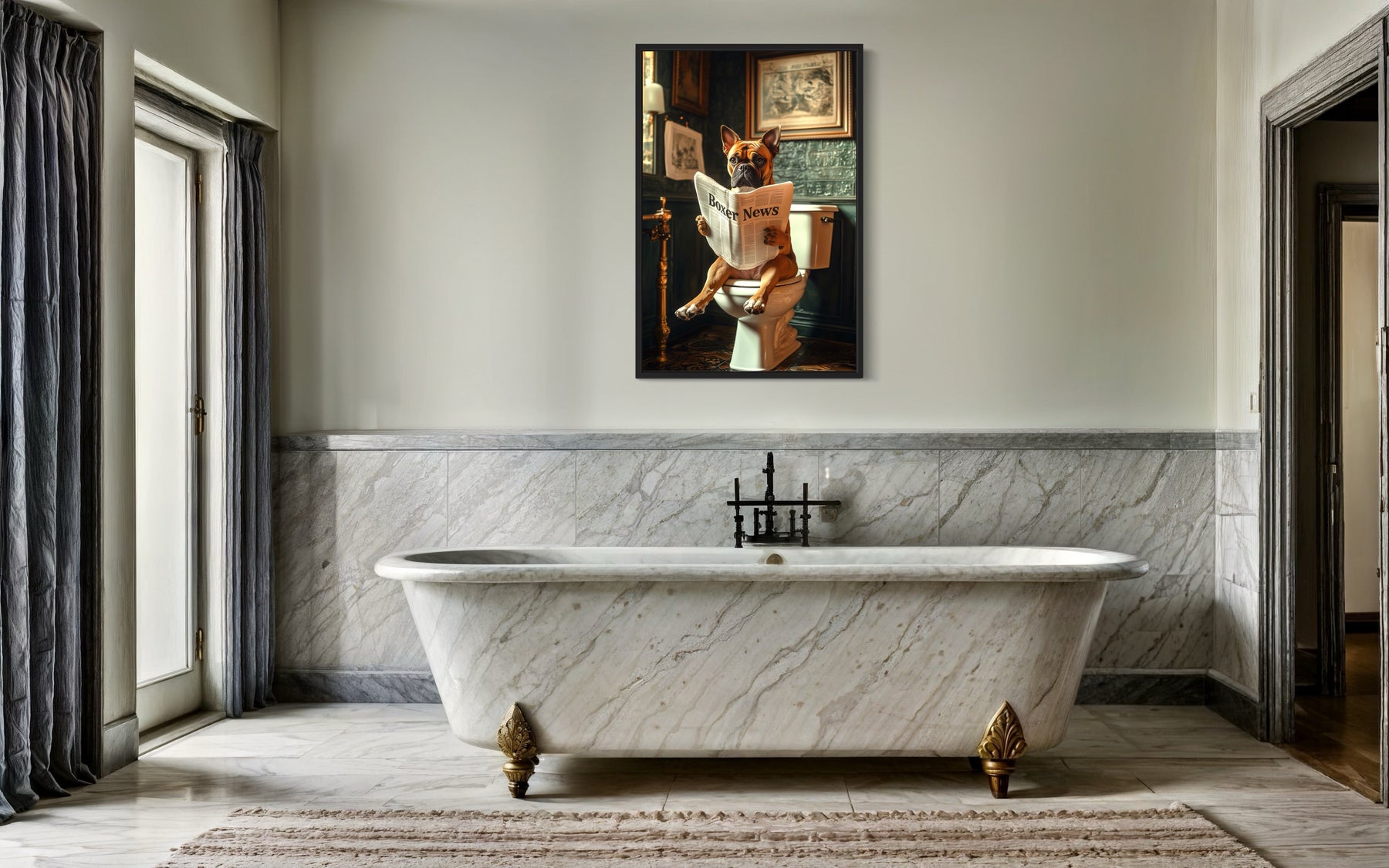 Cette œuvre d'art présente une palette de couleurs chaleureuses et accueillantes avec des bruns riches, des blancs doux et des tons beiges atténués. Les couleurs naturelles du chien boxer sont rendues dans des détails réalistes, ajoutant un sentiment d'authenticité et de charme à la pièce. Le doux contraste entre le chien, le journal et le fond subtil renforce son attrait visuel. Ces teintes terreuses fonctionnent parfaitement dans les espaces aux thèmes de décoration neutres ou rustiques, se mariant parfaitement avec les accents de bois et de pierre. Les tons chauds de l'œuvre d'art ajoutent de la profondeur et du caractère à la salle de bain sans surcharger l'espace. Une touche d'humour est subtilement complétée par les tons apaisants, ce qui en fait une œuvre d'art murale bien équilibrée. Le fond discret garantit que l'attention reste concentrée sur le chien, créant un look cohérent et soigné. Cette palette de couleurs harmonieuse garantit qu'elle s'intègre confortablement dans n'importe quelle salle de bain avec une touche de personnalité.