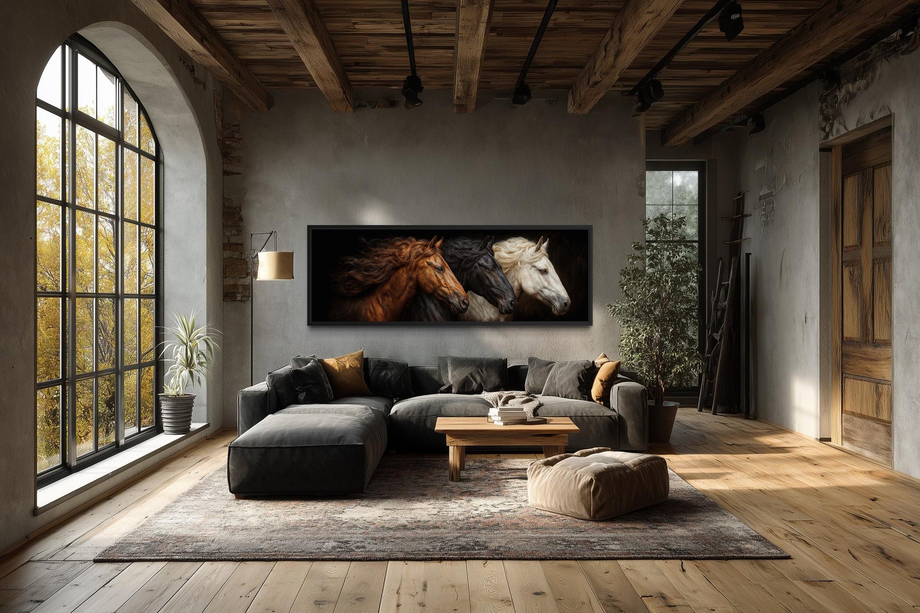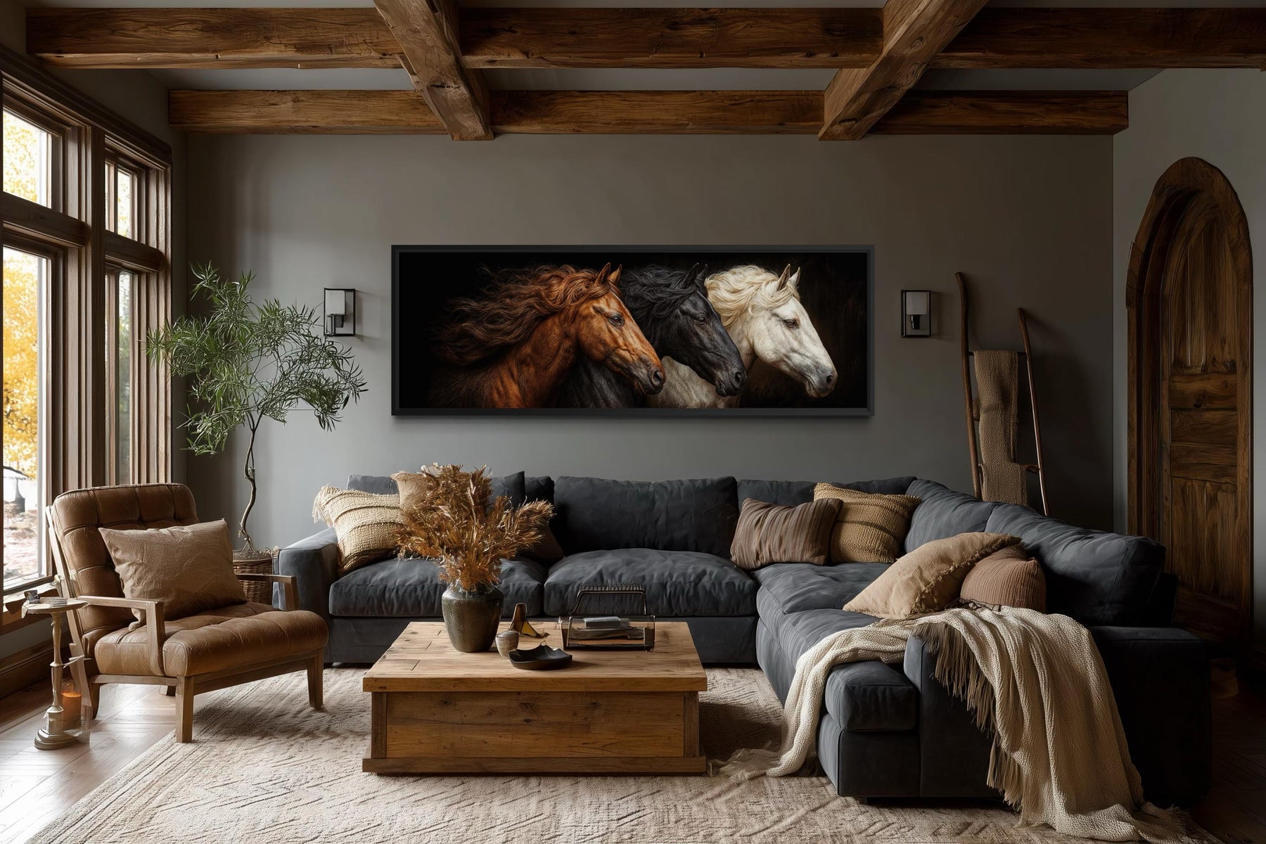 Cette pièce a été conçue pour la maison de l'amoureux des chevaux et le salon moderne qui souhaite un point focal audacieux et émotionnellement puissant sans sacrifier la sophistication ou la crédibilité du design. Un salon construit autour de matériaux sombres, chauds et richement superposés – des sièges en cuir vieilli, du bois recyclé, des revêtements profonds en anthracite ou en lin chaud, et un éclairage tamisé et atmosphérique – trouvera dans cette œuvre murale de chevaux une pièce maîtresse qui lie tous les éléments de l'identité de la pièce avec une autorité visuelle complète. Accrochée au-dessus d'un canapé, centrée sur un mur d'accent sombre, ou exposée au-dessus d'une cheminée où la lumière chaude joue sur les tons châtaigne de la peinture, cette pièce transforme une pièce de simplement bien meublée à véritablement conçue. La maison de l'amoureux des chevaux – qu'il s'agisse d'un ranch, d'une maison de campagne, d'un domaine équestre, ou simplement de la maison de quelqu'un ayant une passion profonde et durable pour ces animaux – trouvera dans cette peinture de trois chevaux une expression de cette passion qui est véritablement belle et parfaitement à l'aise dans un intérieur sérieux et bien conçu. Elle fonctionne puissamment dans des espaces qui penchent déjà vers le naturel, le robuste et le chaleureusement atmosphérique – des pièces avec des poutres apparentes, des accents de pierre et un engagement envers des matériaux qui semblent honnêtes et ancrés. Un bureau à domicile ou un bureau de direction avec des murs sombres et des meubles sérieux trouverait cette pièce une présence particulièrement convaincante et appropriée – la puissance et l'intensité des chevaux communiquant quelque chose de significatif sur l'énergie et la motivation de la personne à qui appartient la pièce. Le grand format horizontal le rend idéal pour les grands murs, au-dessus de longs canapés, ou dans les entrées où son impact visuel immédiat donne le ton pour toute la maison dès que les invités franchissent la porte. Laissez cette œuvre murale sur toile de trois chevaux rendre votre espace aussi audacieux, beau et vivant que les animaux qu'elle célèbre.