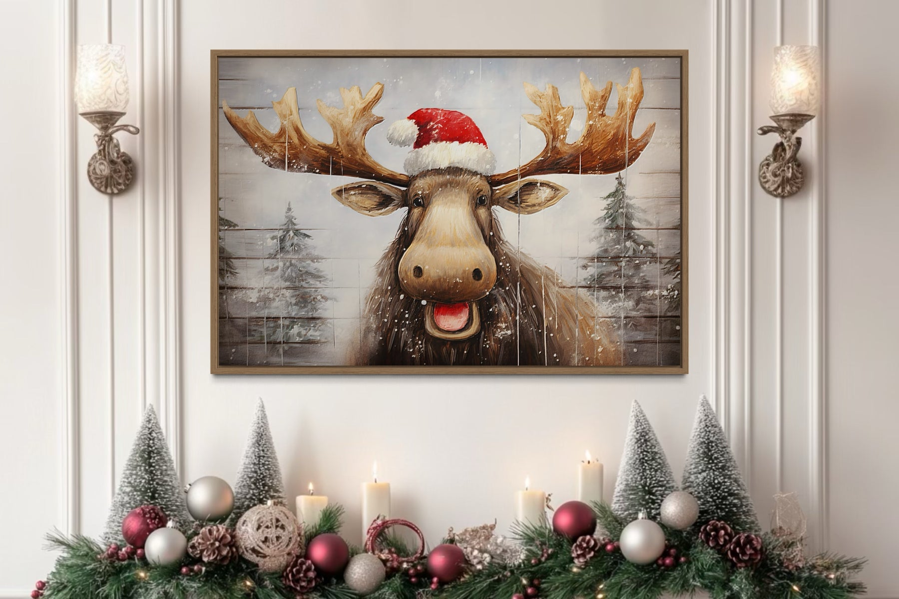 Peinture rustique sur bois représentant un élan mignon portant un chapeau de Père Noël, toile encadrée de Noël