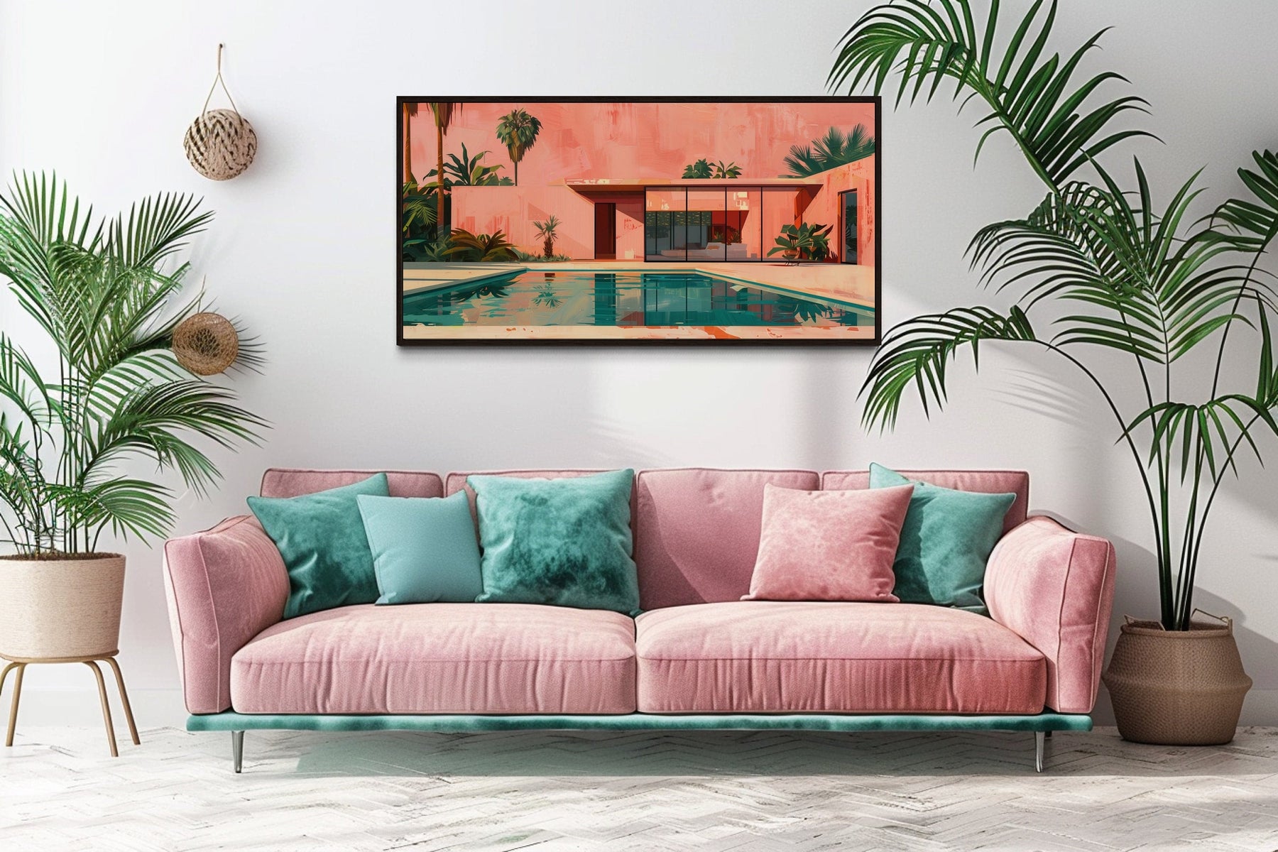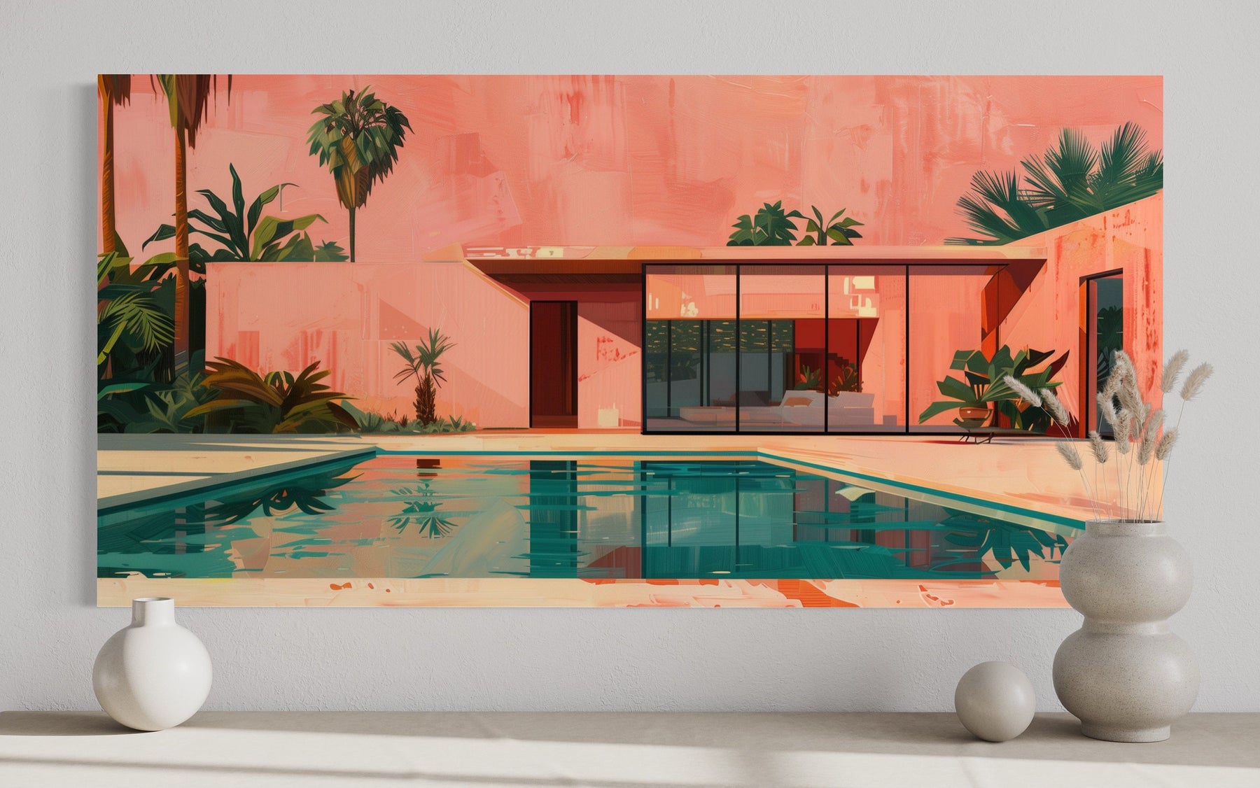 La palette de couleurs de cette toile imprimée architecturale est un mélange vivant de verts doux et de roses vibrants, reflétant le style moderne du milieu du siècle. Les tons verts doux apportent une ambiance apaisante et rafraîchissante, évoquant la tranquillité des paysages luxuriants. En revanche, le rose audacieux ajoute une explosion d'énergie et une sophistication ludique, créant un jeu de teintes dynamique. De subtiles touches de blanc et de beige mettent en valeur les lignes architecturales épurées, améliorant la clarté et la profondeur du design. Les couleurs riches sont équilibrées par des ombres douces et des dégradés, offrant une sensation de réalisme et de texture. Cette palette vibrante la rend idéale pour égayer les intérieurs contemporains ou compléter une décoration d'inspiration rétro. Qu'elle soit associée à des tons neutres ou contrastée avec des couleurs d'accent audacieuses, elle améliore sans effort l'esthétique de la pièce. Laissez les teintes gaies et élégantes de cette toile imprimée architecturale apporter personnalité et charme à votre maison.