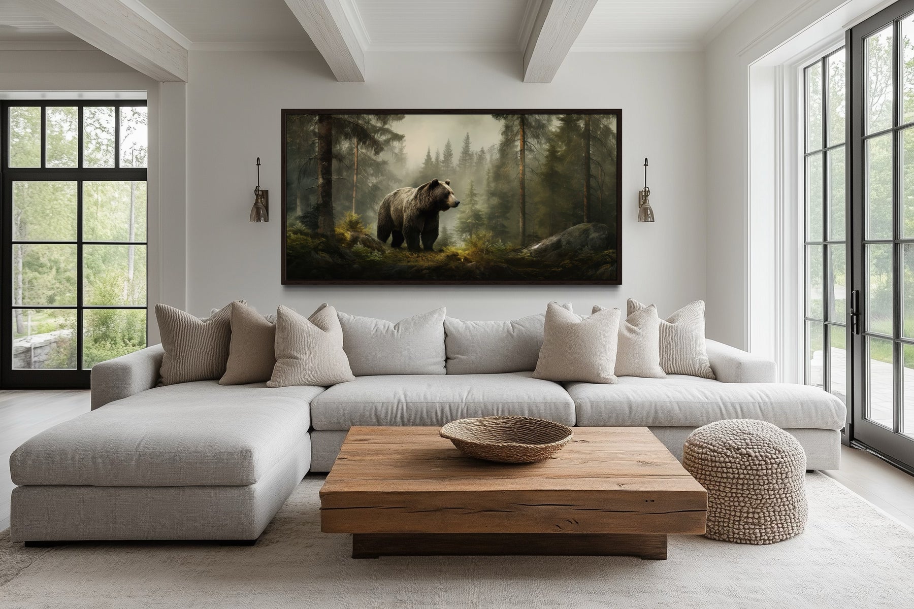 Décoration murale Ours Grizzly – Toile imprimée style chalet rustique | Décoration faune et flore de forêt brumeuse
