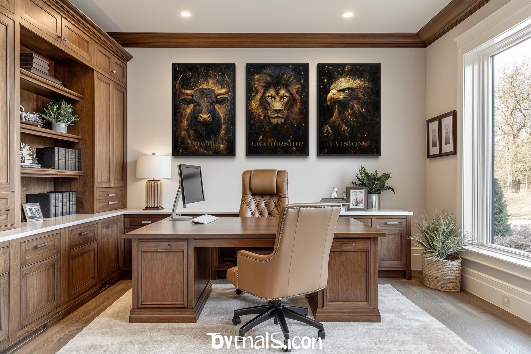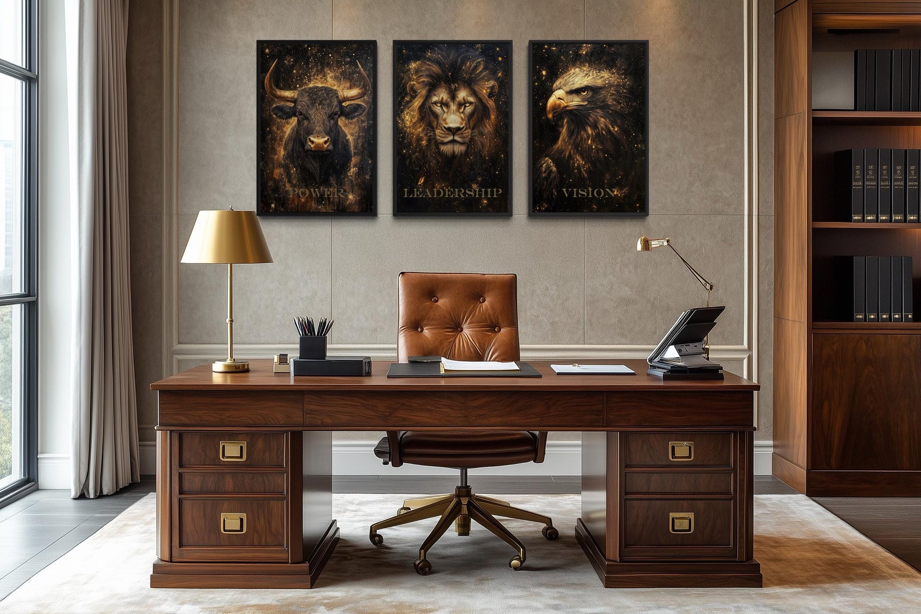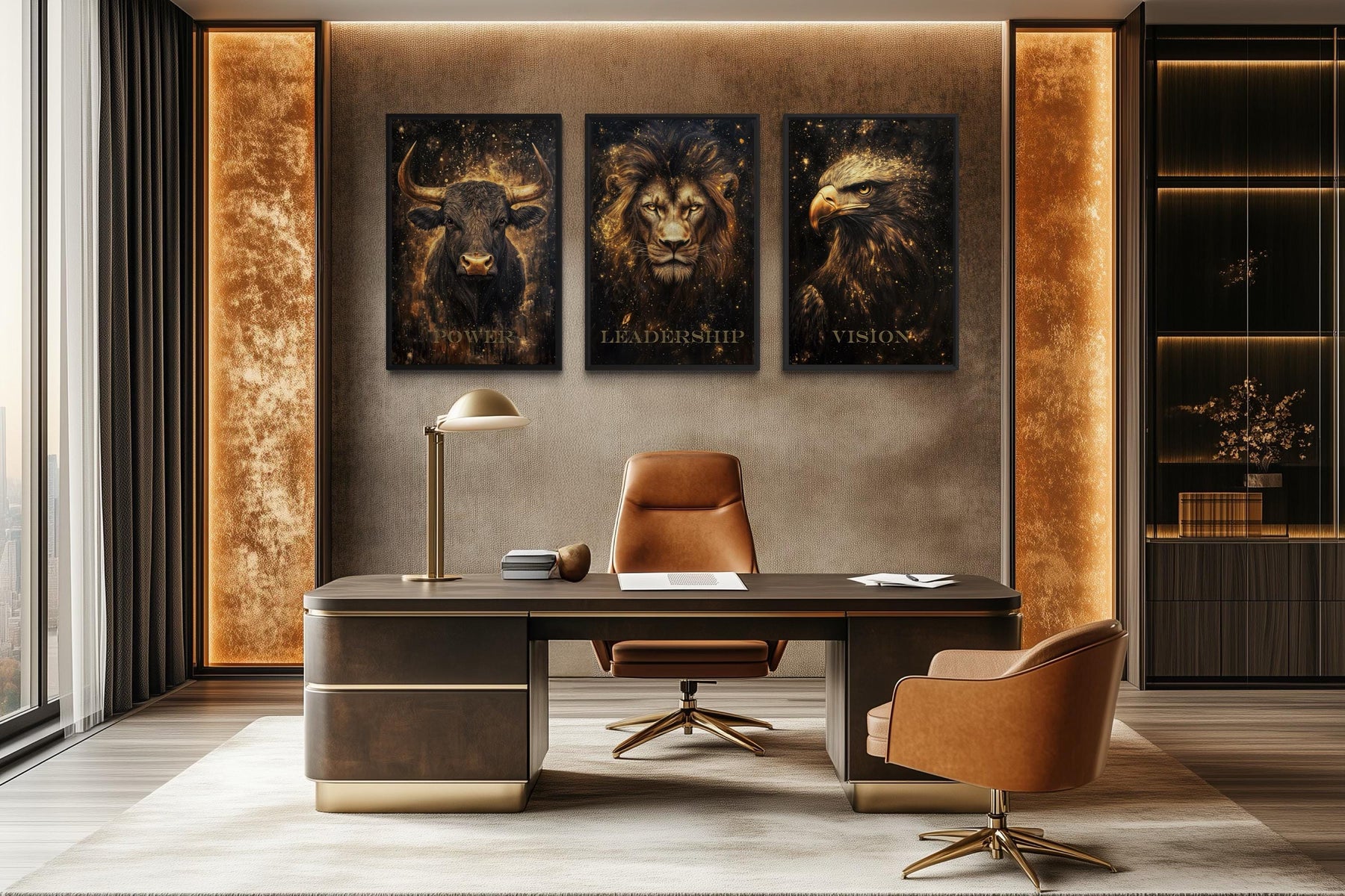 Leadership Wall Art – Motivational Lion Bull Eagle Office Canvas Set for Executive Workspace