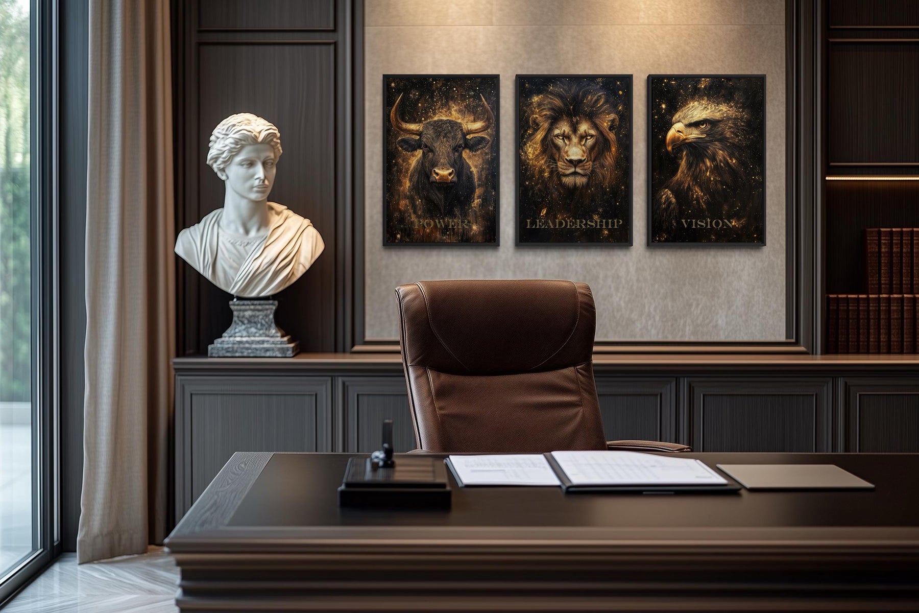 This commanding motivational wall art for leaders embodies the essence of strength, focus, and vision through three timeless symbols of leadership: the lion, the bull, and the eagle. Each panel represents a pillar of personal power — courage, resilience, and perspective — designed to energize any professional environment. The lion stands as a symbol of fearless confidence, its gaze calm yet commanding, exuding the quiet authority of a natural leader. The bull radiates perseverance and drive, embodying the discipline to push forward with steady force even when challenges arise. The eagle completes the set with sharp precision and elevated vision, reminding the viewer to maintain clarity and strategy from above. Together, these artworks form a visual symphony of ambition and balance, inspiring those who value determination and thoughtful strength. The fine detailing of fur, feathers, and form is highlighted by subtle golden undertones that bring depth to the dark background, creating contrast that feels both regal and contemporary. This artwork set serves as a powerful statement piece in any executive workspace, private office, or study, merging luxury with inspiration in a way that motivates without words.