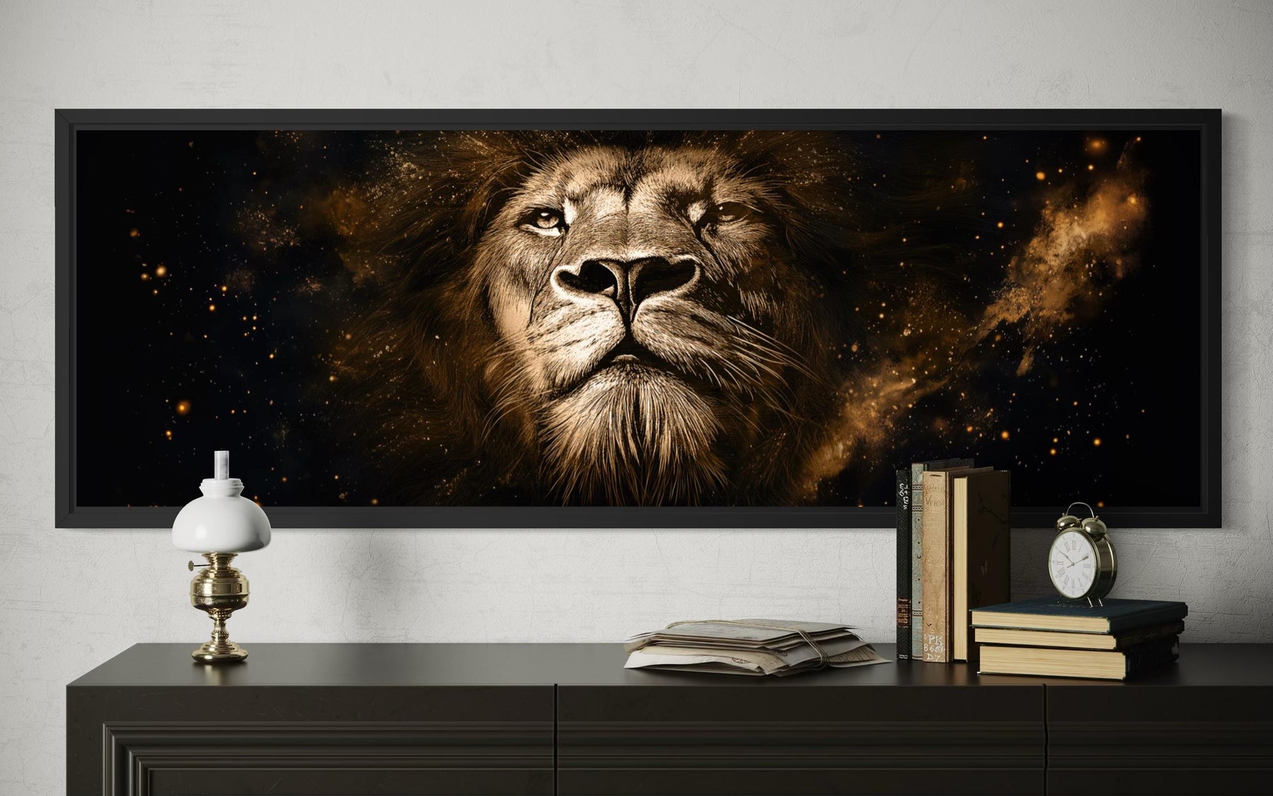 Ce design est idéal pour les espaces masculins raffinés ou les salons à l'allure résolument masculine, où force et sobriété caractérisent l'espace. Dans une pièce aux canapés en cuir noir, aux accents de laiton brossé et aux tons de bois foncé, cette pièce devient le point d'ancrage autour duquel s'organise l'ensemble. Son format long et étroit s'intègre parfaitement au-dessus d'un canapé, d'un bar ou d'un mur de bureau, structurant les grands espaces et apportant une touche théâtrale aux plus petits. Le fond noir épuré garantit son harmonie avec les textures existantes, tandis que les reflets dorés apportent la chaleur nécessaire pour adoucir les intérieurs industriels ou modernes. Il trouve sa place dans les espaces jouant avec les ombres et la lumière, où un éclairage tamisé, des formes affirmées et un mobilier sombre donnent le ton. Il intensifie l'espace sans le surcharger, conférant à la pièce une présence visuelle forte. Cette pièce n'a pas besoin d'être intégrée à un mur de cadres : elle s'exprime pleinement seule, avec force et assurance. Associée à un sol en béton ou à des meubles noirs, elle crée une atmosphère d'élégance intemporelle. Pour les collectionneurs de motifs animaliers qui apprécient également l'élégance et les structures modernes, il s'agit de bien plus qu'un simple élément de décoration : c'est une expression de leur identité. C'est la touche finale d'une saisissante décoration murale représentant un lion.