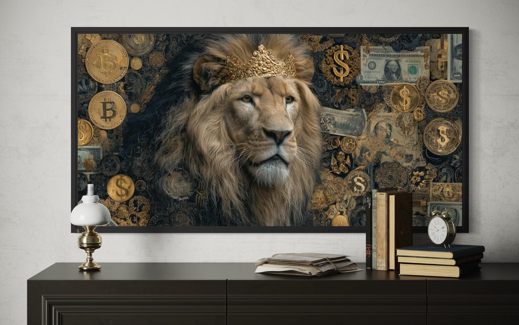 Tableau Lion Money – Toile tendue de luxe dorée pour la décoration d'un repaire masculin