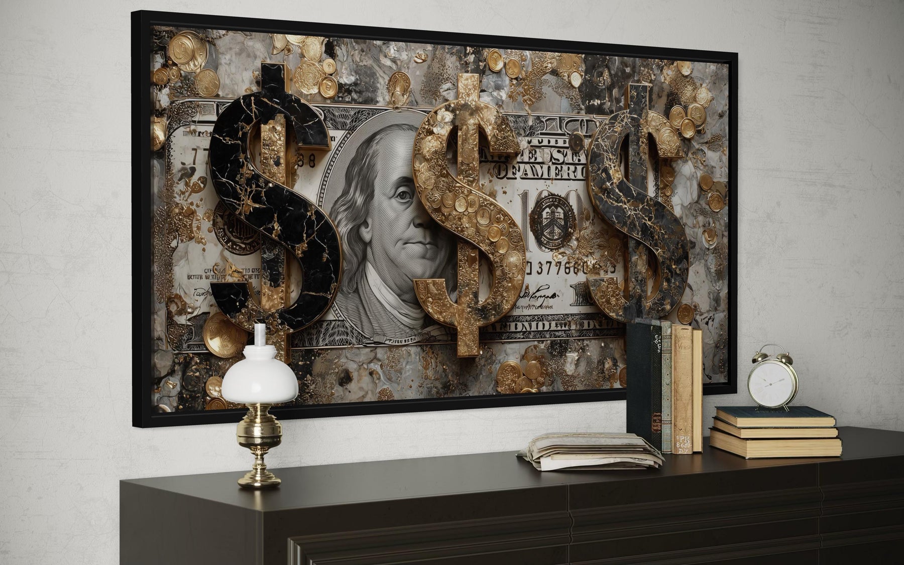 Notre toile murale « Money Wall Art » insuffle luxe, ambition et dynamisme financier à votre intérieur grâce à un audacieux symbole du dollar entouré de pièces d'or, d'une représentation de Benjamin Franklin et d'une texture artistique saisissante. Cette impression sur toile mêle symbolisme monétaire et effets de pinceau abstraits, conférant à l'œuvre une allure moderne, puissante et visuellement percutante, même de loin. Le dollar surdimensionné attire le regard, se superposant à des tons monétaires, des détails de portrait vintage et des effets métalliques peints qui lui donnent une impression de richesse et de mouvement. Benjamin Franklin apparaît sous forme de collage partiel, ajoutant une touche d'imagerie bancaire américaine classique sans pour autant transformer le motif en une simple reproduction de billet de banque. Les pièces d'or et les éclaboussures texturées créent profondeur et richesse, donnant à l'œuvre une impression de luxe et d'expressivité, loin d'un aspect plat ou graphique. L'équilibre entre ombres profondes, reflets dorés et coups de pinceau superposés crée un effet galerie d'art, à la fois audacieux et motivant. Chaque détail a été pensé pour projeter succès, confiance et aisance financière, faisant de cette toile une pièce maîtresse idéale pour les bureaux, les espaces de détente, les espaces professionnels et les intérieurs inspirés par les entrepreneurs. Son format horizontal est idéal pour être accroché au-dessus d'un bureau, d'un canapé, d'un bar ou d'un espace de travail. Il donne instantanément le ton à la pièce : une ambiance dynamique, ambitieuse et résolument axée sur la réussite. C'est une décoration élégante pour ceux qui perçoivent l'argent comme un moteur, un atout et un style de vie, ce qui en fait un exemple remarquable d'art mural sur le thème de l'argent.