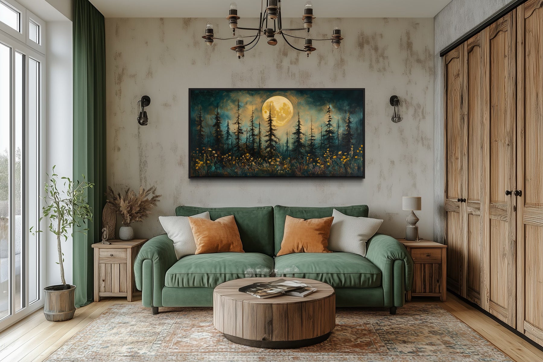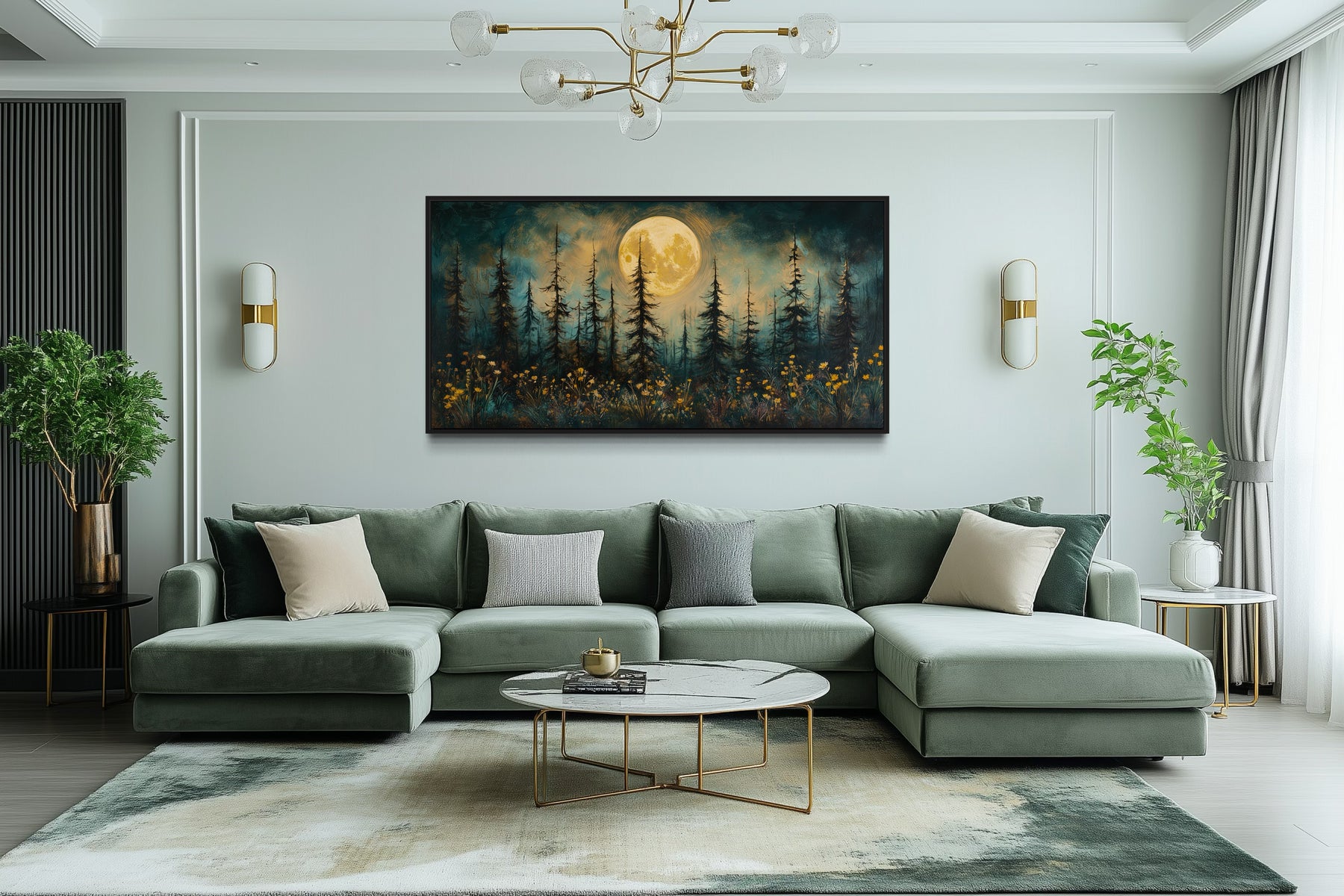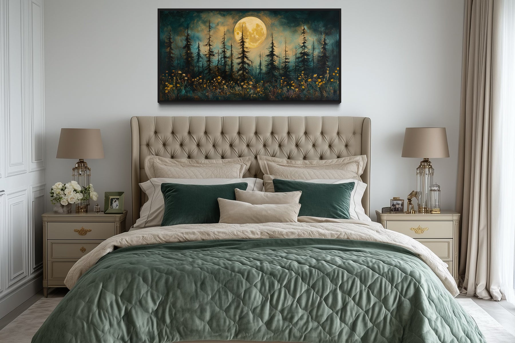 Notre décoration murale de forêt au clair de lune est le complément parfait aux chambres d'inspiration gothique, aux études universitaires sombres ou aux espaces de vie sur le thème de la nature. Cette pièce complète les intérieurs qui adoptent des combinaisons de couleurs riches et profondes, ce qui la rend idéale pour les maisons avec des meubles en bois foncé, des textiles en velours et des accents antiques. Dans les décors gothiques, elle se marie à merveille avec des éléments en fer forgé, une décoration aux chandelles et des draperies spectaculaires, renforçant une atmosphère de mystère et de romantisme. Pour une pièce inspirée de la fantaisie ou des contes de fées, cette œuvre d'art met en valeur l'esthétique magique, créant un espace qui ressemble à un portail vers un autre monde. C'est également un excellent choix pour les cabanes rustiques, où sa représentation de la forêt la nuit s'harmonise avec les textures de bois naturel, les intérieurs chaleureux et la décoration inspirée de la nature. Qu'elle soit placée dans une retraite en forêt, au-dessus d'une cheminée ou comme point focal dans un coin lecture, cette œuvre d'art transforme n'importe quel espace en une escapade mystique. Toute personne à la recherche d'une peinture de forêt sombre et enchantée trouvera dans cette pièce un point focal captivant et immersif.