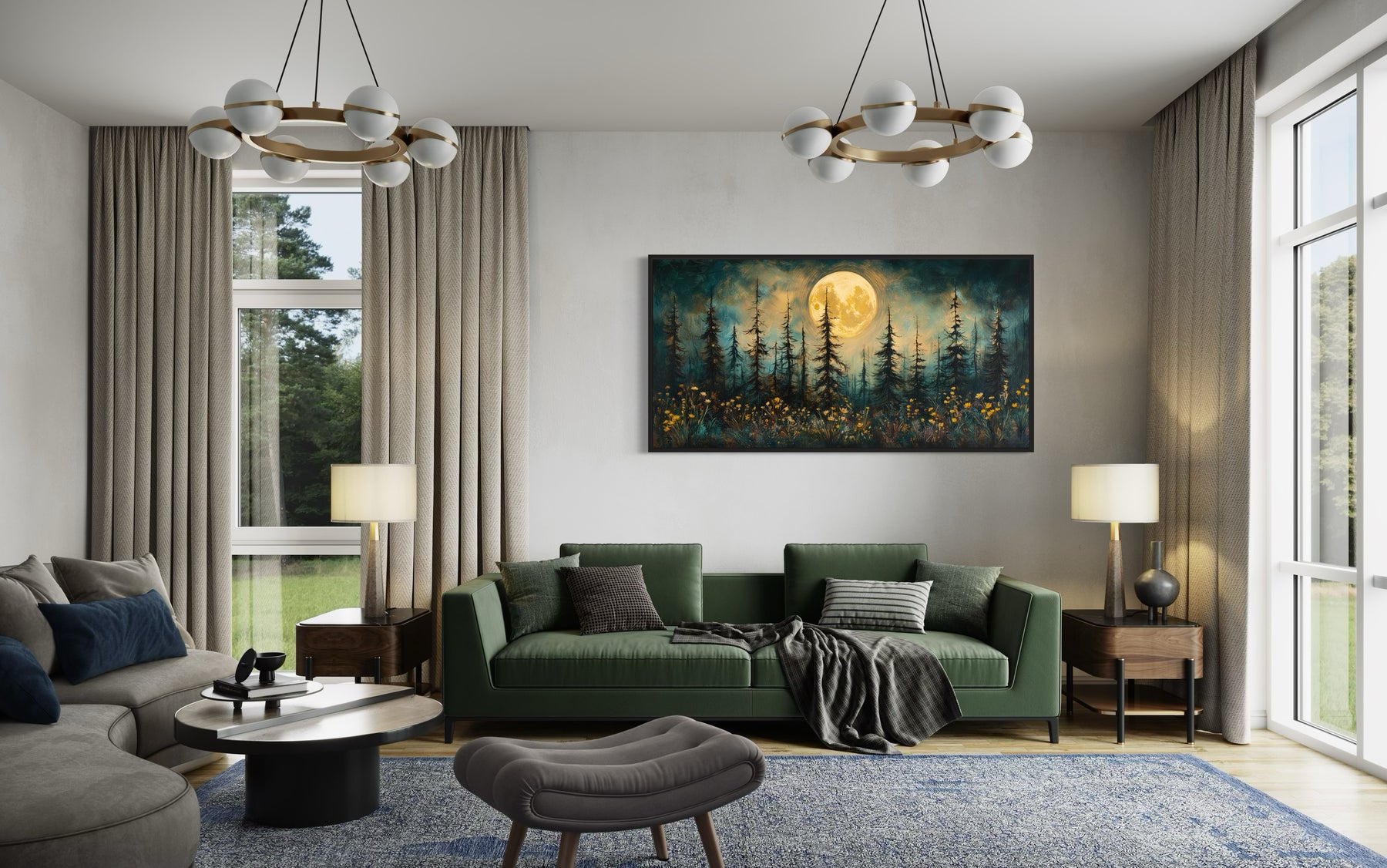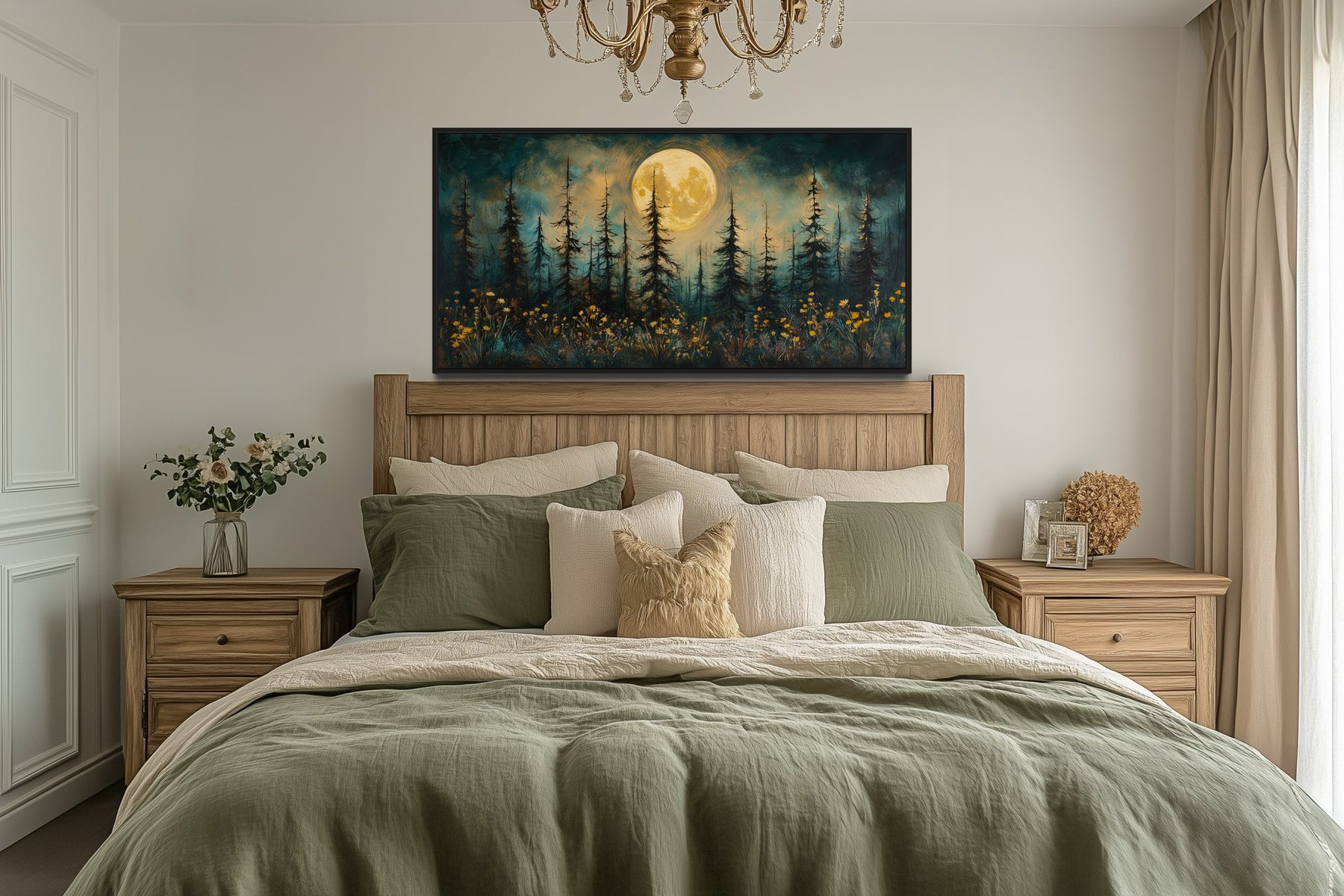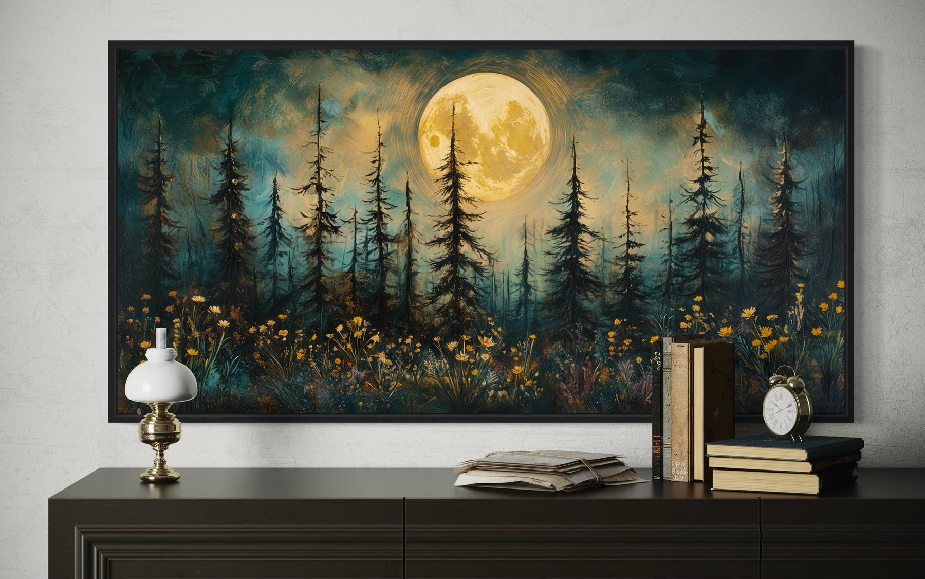 Notre décoration murale de forêt au clair de lune est le complément parfait aux chambres d'inspiration gothique, aux études universitaires sombres ou aux espaces de vie sur le thème de la nature. Cette pièce complète les intérieurs qui adoptent des combinaisons de couleurs riches et profondes, ce qui la rend idéale pour les maisons avec des meubles en bois foncé, des textiles en velours et des accents antiques. Dans les décors gothiques, elle se marie à merveille avec des éléments en fer forgé, une décoration aux chandelles et des draperies spectaculaires, renforçant une atmosphère de mystère et de romantisme. Pour une pièce inspirée de la fantaisie ou des contes de fées, cette œuvre d'art met en valeur l'esthétique magique, créant un espace qui ressemble à un portail vers un autre monde. C'est également un excellent choix pour les cabanes rustiques, où sa représentation de la forêt la nuit s'harmonise avec les textures de bois naturel, les intérieurs chaleureux et la décoration inspirée de la nature. Qu'elle soit placée dans une retraite en forêt, au-dessus d'une cheminée ou comme point focal dans un coin lecture, cette œuvre d'art transforme n'importe quel espace en une escapade mystique. Toute personne à la recherche d'une peinture de forêt sombre et enchantée trouvera dans cette pièce un point focal captivant et immersif.