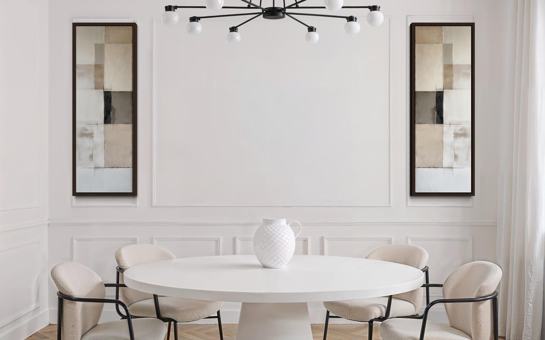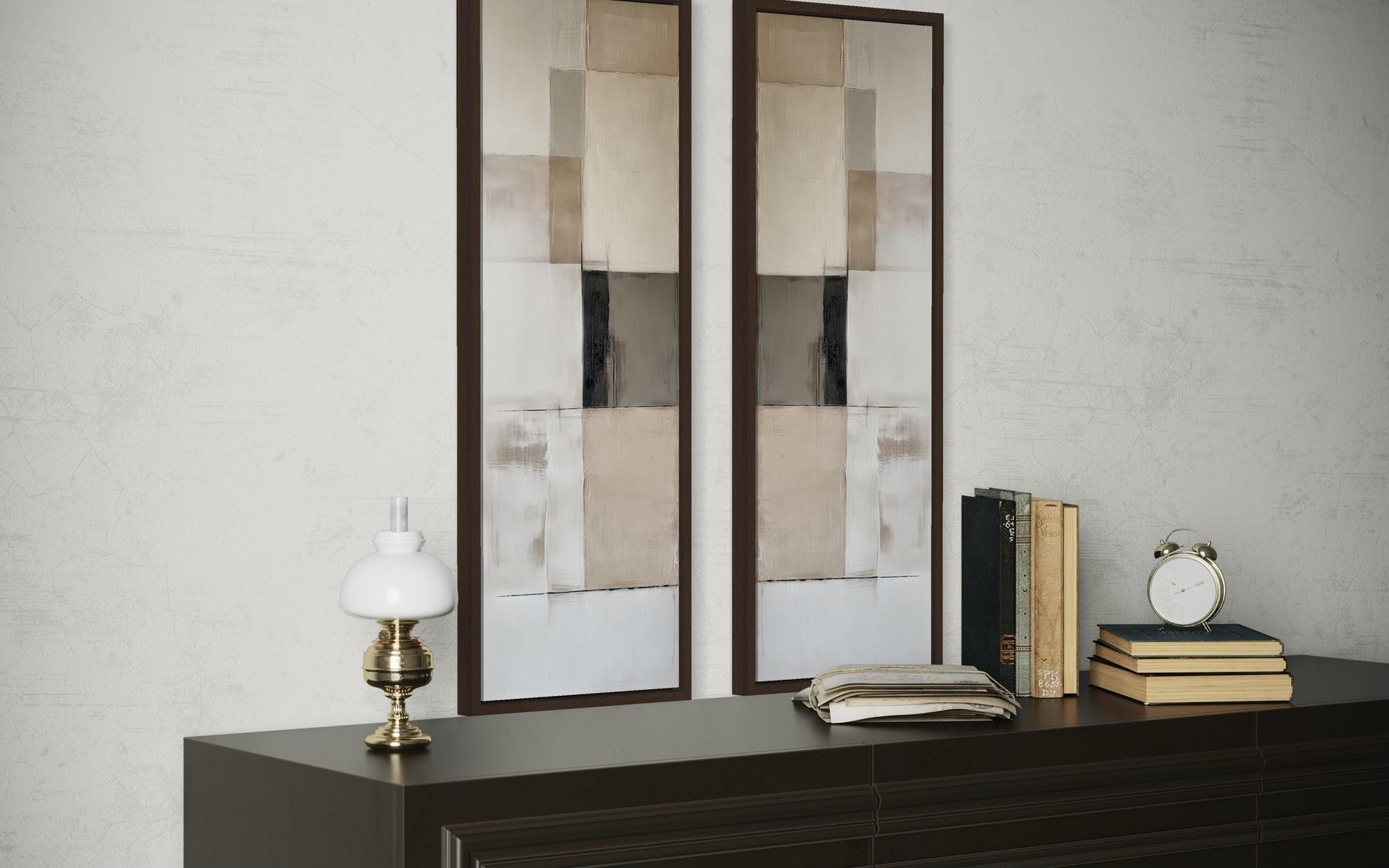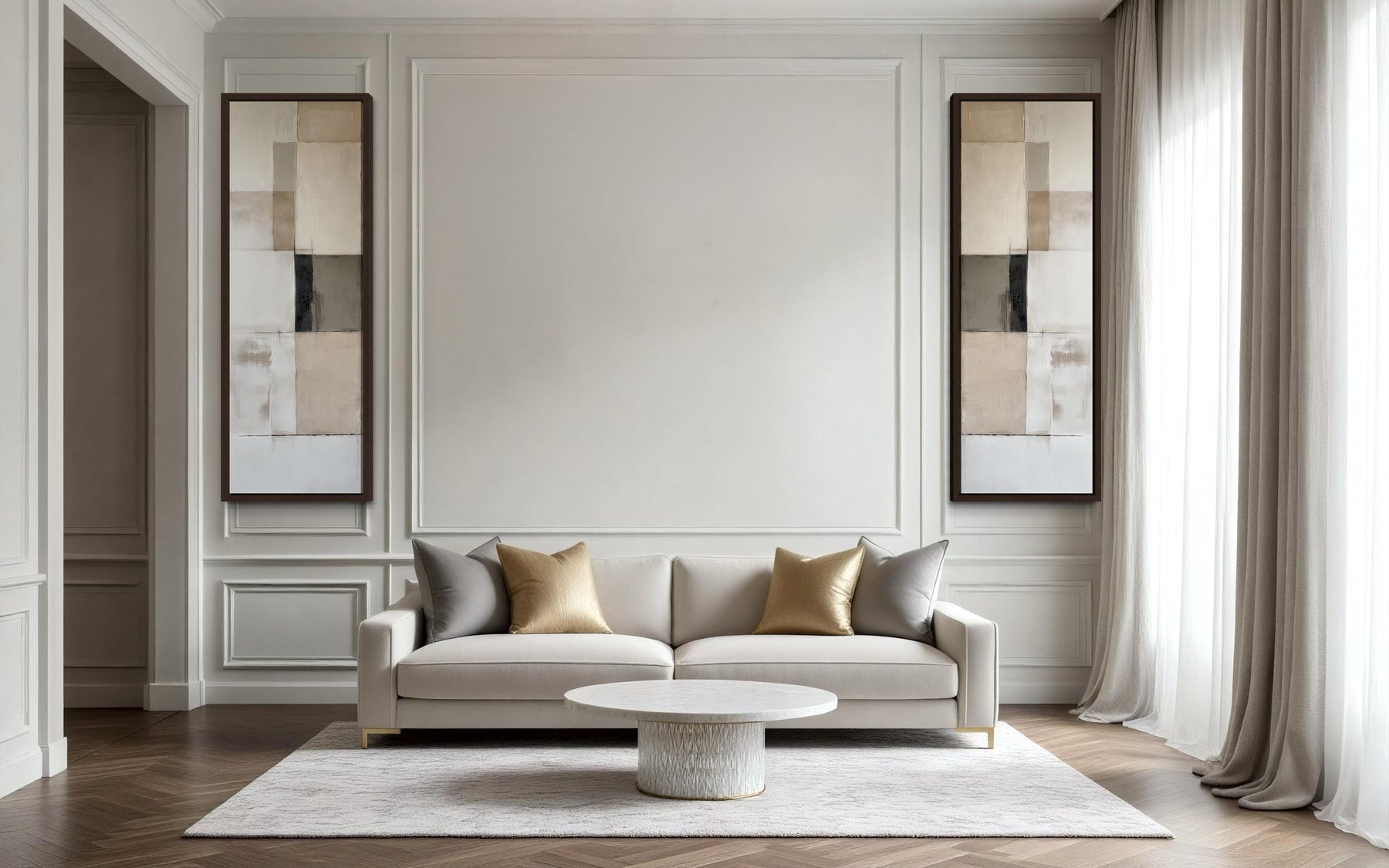 Cet ensemble a été conçu pour la maison moderne et contemporaine — spécifiquement pour l'intérieur où l'intelligence du design, la qualité des matériaux et la sobriété visuelle sont les valeurs les plus élevées, et où l'art est choisi non pas pour remplir un mur mais pour compléter l'esthétique soigneusement étudiée d'une pièce avec une précision et une autorité complètes. Un salon moderne aux lignes architecturales épurées, une palette neutre de blancs chauds et de gris, des meubles d'exception en bois chaud ou en cuir, et un engagement envers des espaces qui semblent véritablement conçus plutôt que meublés de manière décontractée trouveront dans cet ensemble d'art mural abstrait géométrique un diptyque qui s'intègre à l'esthétique de la pièce comme s'il avait toujours fait partie de l'intention de conception originale. Le format étroit et haut à deux panneaux répond à l'un des défis les plus courants et persistants de la conception intérieure contemporaine — comment introduire de l'art dans un espace avec de hauts plafonds et des segments de mur verticaux nets sans recourir à des pièces surdimensionnées qui dominent ou à des arrangements de galerie qui semblent trop décontractés et collectés pour l'atmosphère épurée et précise que la pièce essaie de maintenir. Un bureau à domicile moderne avec des surfaces de bureau épurées, des accents de bois chauds et un engagement envers un encombrement visuel minimal trouvera dans cet ensemble le compagnon artistique idéal — offrant une présence de design sophistiquée sans introduire de couleur, de sujet ou de complexité visuelle qui pourrait distraire du travail concentré ou perturber le calme réfléchi de la pièce. L'intérieur d'inspiration scandinave ou nordique — murs blancs, bois pâle chaud, accessoires minimaux, lin naturel et amour de la beauté propre et fonctionnelle — trouvera cet ensemble parfaitement naturel et profondément satisfaisant, les neutres géométriques reflétant les mêmes valeurs de design qui définissent les meilleurs intérieurs nordiques. Une chambre contemporaine à l'esthétique épurée et dégagée trouvera dans cet ensemble, placé de part et d'autre d'un lit ou sur un mur étroit de la chambre, le genre de moment de design discret et réfléchi qui donne à une pièce l'impression d'avoir été conçue par quelqu'un qui comprend vraiment ce qu'est la beauté moderne. Laissez cet ensemble de 2 toiles murales abstraites géométriques neutres et étroites faire de votre maison moderne l'espace le plus discrètement sophistiqué et le plus complètement réfléchi possible.