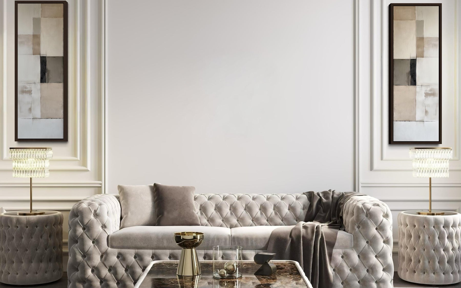 Cet ensemble de 2 peintures abstraites géométriques opère dans l'une des palettes les plus raffinées et universellement compatibles de tout l'art mural contemporain — une collection soigneusement sélectionnée de neutres chauds et froids qui passe du blanc cassé crémeux pâle au taupe chaud et au grège doux, puis au gris chaud moyen et à l'anthracite plus profond, le tout agencé en plans géométriques qui créent un contraste tonal et un rythme visuel sans introduire de couleur susceptible de limiter la compatibilité de l'ensemble avec la plus large gamme possible de palettes intérieures. Les neutres chauds — blanc cassé, crème, taupe chaud et grège — occupent les plans géométriques plus clairs de chaque composition, offrant l'espace respiratoire visuel et la chaleur qui empêchent l'ensemble de paraître froid ou trop corporate dans sa sobriété. Les gris moyens plus froids et les tons anthracite plus profonds occupent les blocs géométriques plus foncés, créant le contraste essentiel qui donne à chaque composition sa définition graphique et sa clarté structurelle — l'équivalent design d'une ombre architecturale révélant la forme. La relation entre le chaud et le froid dans la gamme neutre est soigneusement équilibrée sur les deux panneaux, garantissant que le diptyque est harmonieux et cohérent lorsqu'il est accroché ensemble, tandis que chaque toile individuelle fonctionne également comme une composition complète et autonome. Cette œuvre d'art abstraite neutre s'harmonise sans effort avec pratiquement toutes les palettes intérieures imaginables — blanc, crème, gris chaud, anthracite, marine, sauge, terre cuite, blush, et toutes les finitions en bois chaud, béton, lin, cuir et métal que les intérieurs contemporains et modernes emploient. C'est le rare ensemble d'art qui ne rivalise pas avec le décor existant, mais l'élève plutôt — offrant une texture visuelle sophistiquée et une intelligence de conception sans exiger de concessions de couleur de la pièce qui l'entoure.