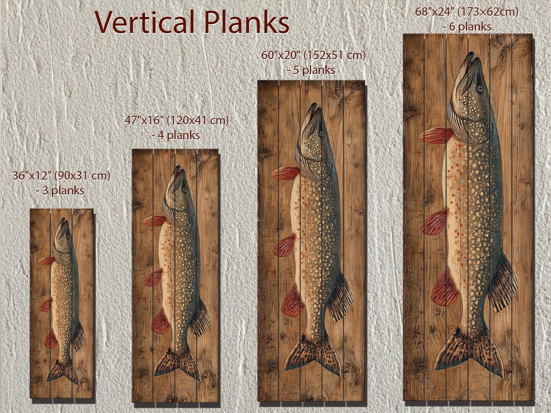 Vertical northern pike wall art on horizontal wood planks, shown in four different sizes.
