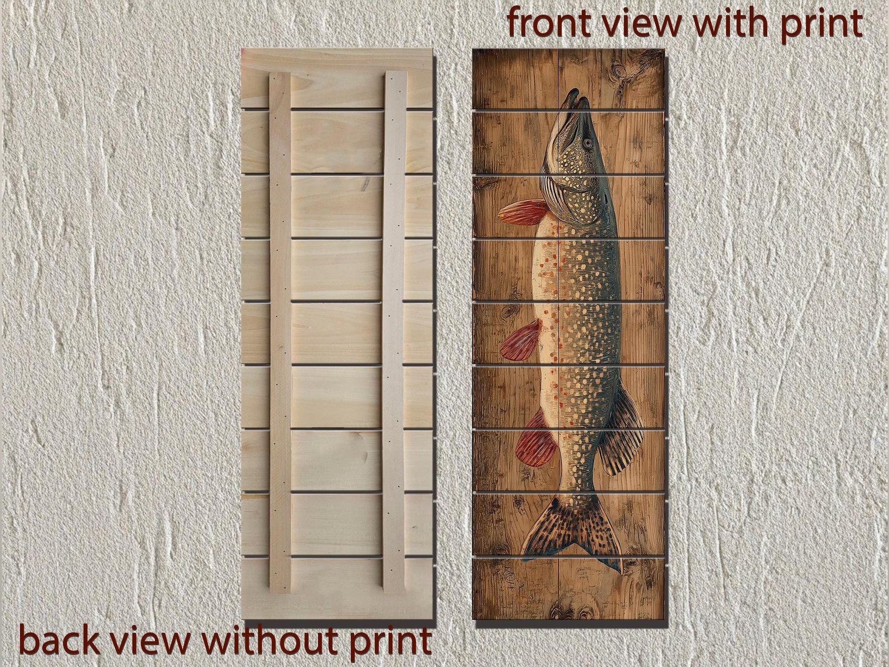 Vertical distressed wood wall art featuring a detailed northern pike illustration in a rustic room.