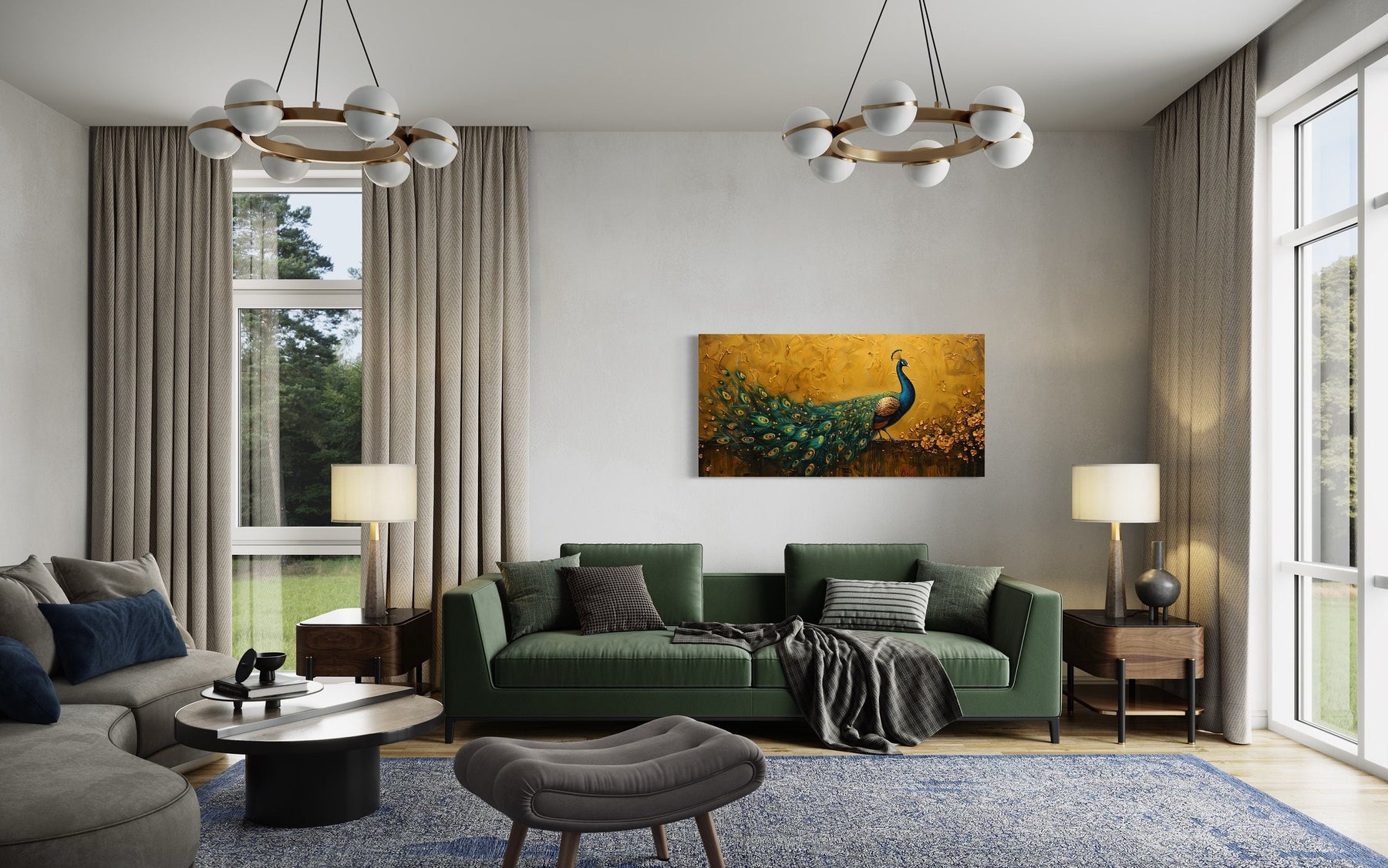 Cette toile de paon est idéale pour les maisons au décor moderne ou vintage. Son design élégant complète les intérieurs contemporains, ajoutant une touche de couleur et de sophistication audacieuse. En même temps, elle s'intègre parfaitement dans des décors plus traditionnels, où son attrait classique peut briller. Parfaite pour les salons, les salles à manger ou même les chambres, cette toile imprimée rehausse n'importe quel espace avec son charme royal. Faites une déclaration dans votre maison avec cette toile murale unique et luxueuse, conçue pour impressionner et inspirer. Les détails exquis et les couleurs vibrantes font de cette toile un ajout élégant à votre maison. paon sur fond doré, une pièce remarquable qui rehaussera sans effort la décoration de votre maison.