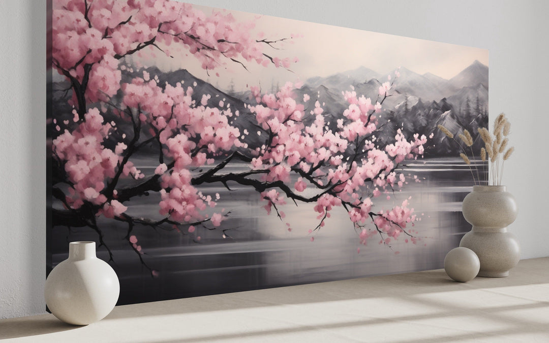 La peinture abstraite de paysage de fleurs de cerisier roses sur fond noir est une pièce saisissante qui contraste magnifiquement la beauté délicate des fleurs de cerisier sur un fond sombre et audacieux. Cette impression sur toile présente une superbe gamme de fleurs de sakura d'un rose vif, élégamment placées sur un fond noir profond, créant un effet dramatique et accrocheur. La composition de cette œuvre d'art murale de sakura japonaise est à la fois moderne et intemporelle, ce qui en fait un point focal idéal pour tout salon ou chambre à coucher. Le paysage abstrait ajoute une touche de mystère et de sophistication, renforçant l'impact global de l'œuvre d'art. Cette peinture de fleurs de cerisier roses est parfaite pour ceux qui apprécient un mélange d'élégance et d'audace dans leur décoration. Le long format horizontal de la toile souligne encore plus la beauté balayante des fleurs de cerisier, ce qui en fait un ajout captivant à n'importe quel espace.