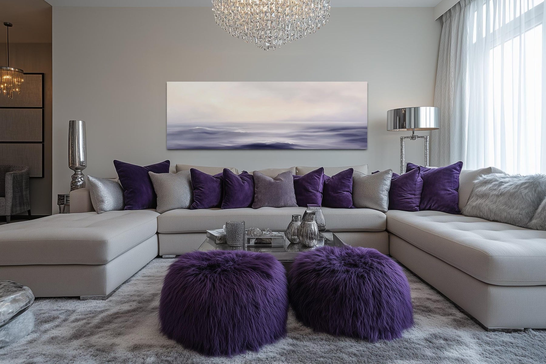 La palette de couleurs de cette décoration murale « Vagues de l'océan pourpre » s'articule autour de nuances de lavande, de violet doux, de gris délicats et de blancs brumeux qui se fondent harmonieusement pour créer une atmosphère paisible. Les pourpres, plus profonds près de la ligne de flottaison, s'éclaircissent et s'illuminent à mesure qu'ils s'élèvent vers l'horizon, conférant à l'œuvre une douceur et une profondeur remarquables. De subtiles nuances de bleu frais se mêlent aux vagues pour équilibrer la chaleur des tons lavande, évitant ainsi une ambiance trop chaude ou trop froide. Des touches de gris neutre ancrent la composition et ajoutent une sophistication discrète à l'ensemble. Le ciel, d'un blanc immaculé, crée une lueur éthérée, soulignant la sérénité du paysage côtier. Ces tons fondus apportent harmonie et élégance aux pièces décorées dans des tons calmes, feutrés ou pastel. Les transitions entre les tons sont douces et naturelles, révélant une palette côtière raffinée, sans aucune rupture. Même de loin, l'œuvre paraît lumineuse et apaisante grâce au dégradé brumeux entre les vagues et le ciel. Cette palette favorise une sensation de paix et d'ouverture, quel que soit l'endroit où elle est placée. L'ensemble de cette étude de couleurs s'achève en mettant en valeur la douce beauté du tableau « Vagues de l'océan violet ».