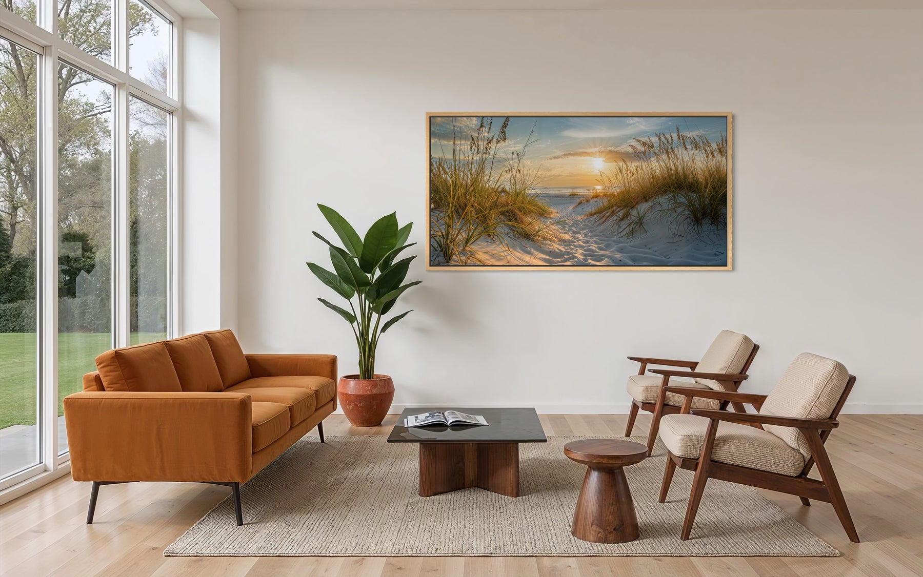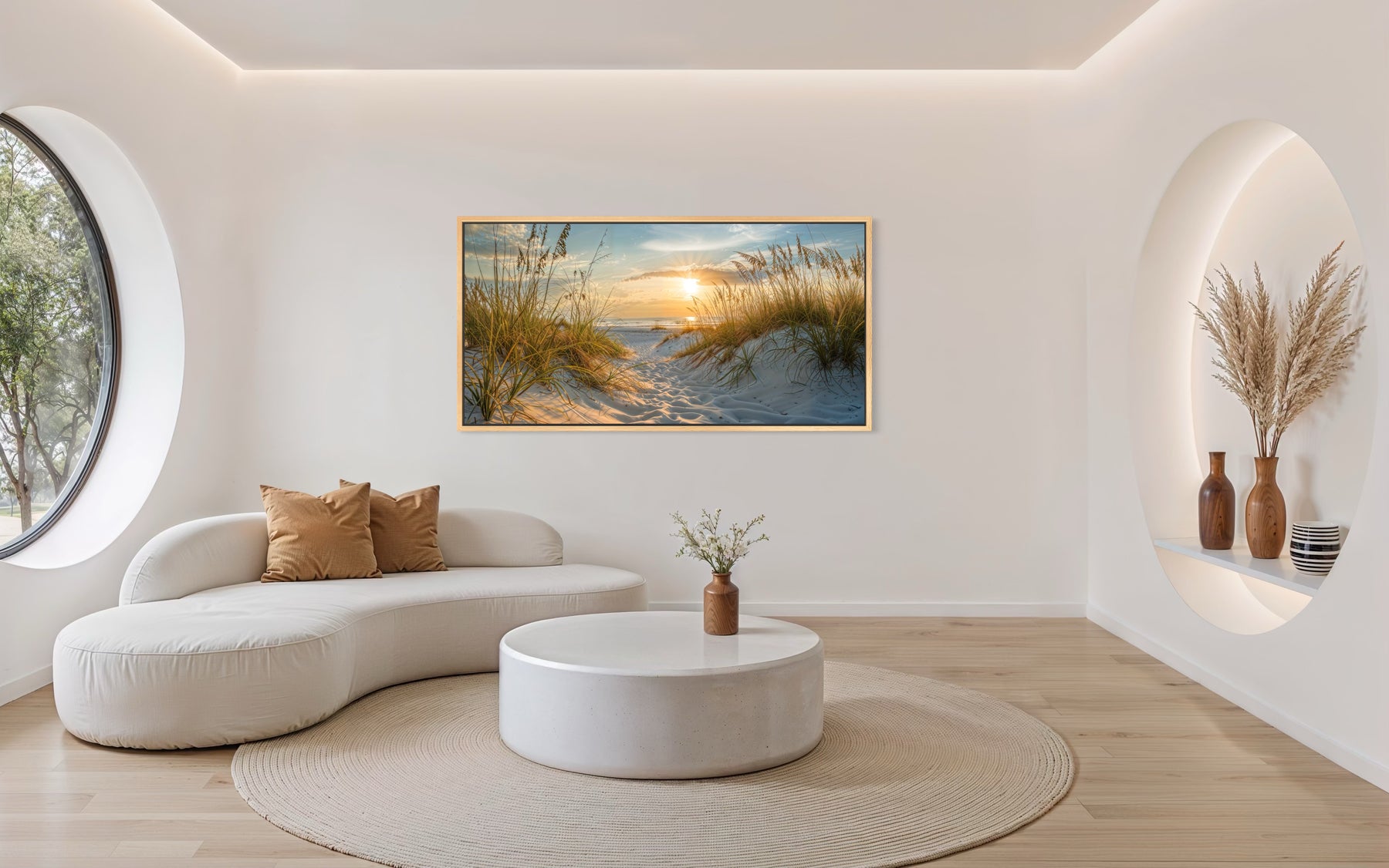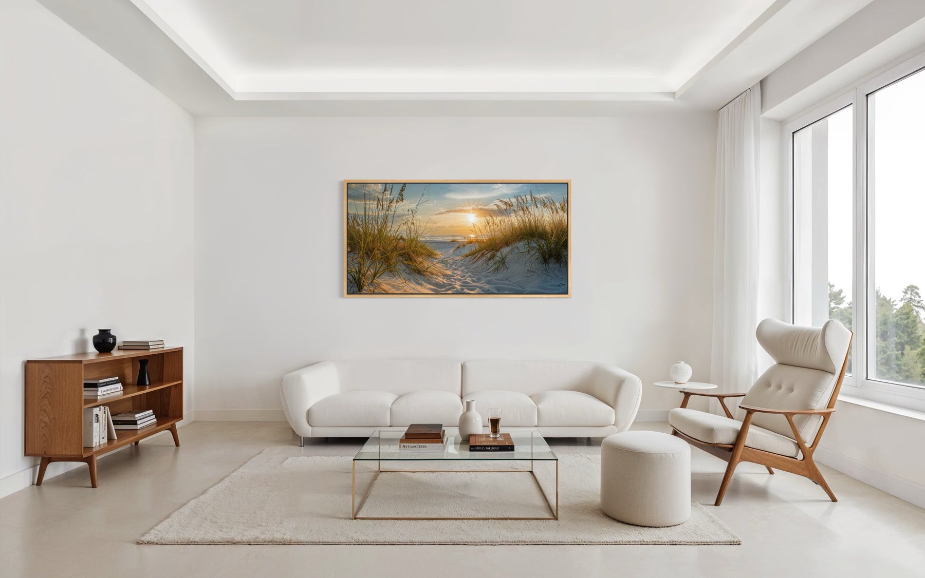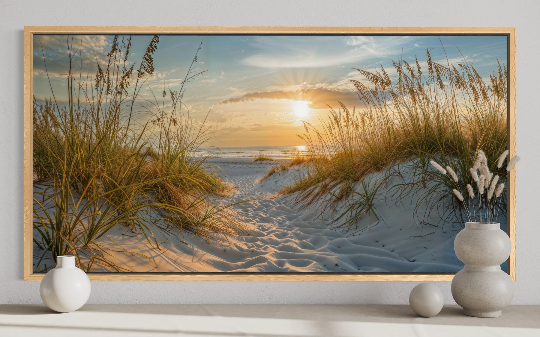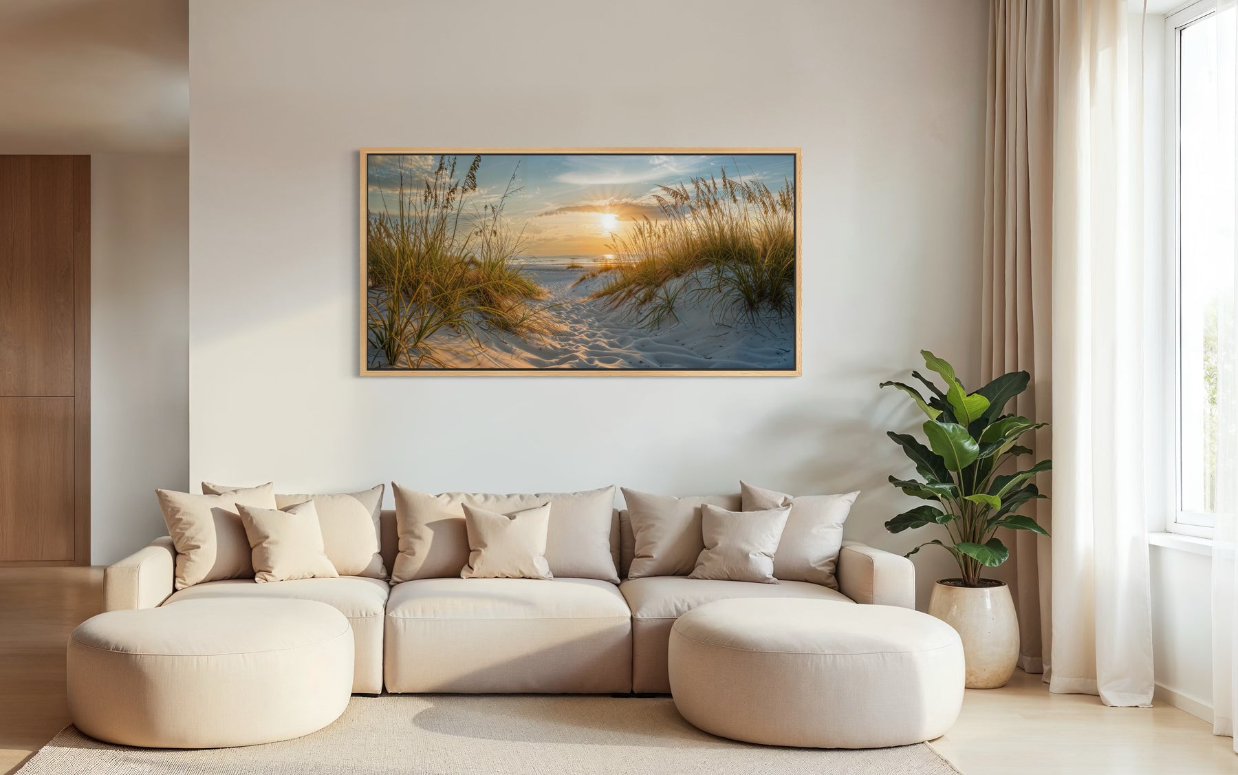 Tableau coucher de soleil sur la plage – Toile encadrée Dunes de sable | Décoration murale côtière pour maison de plage