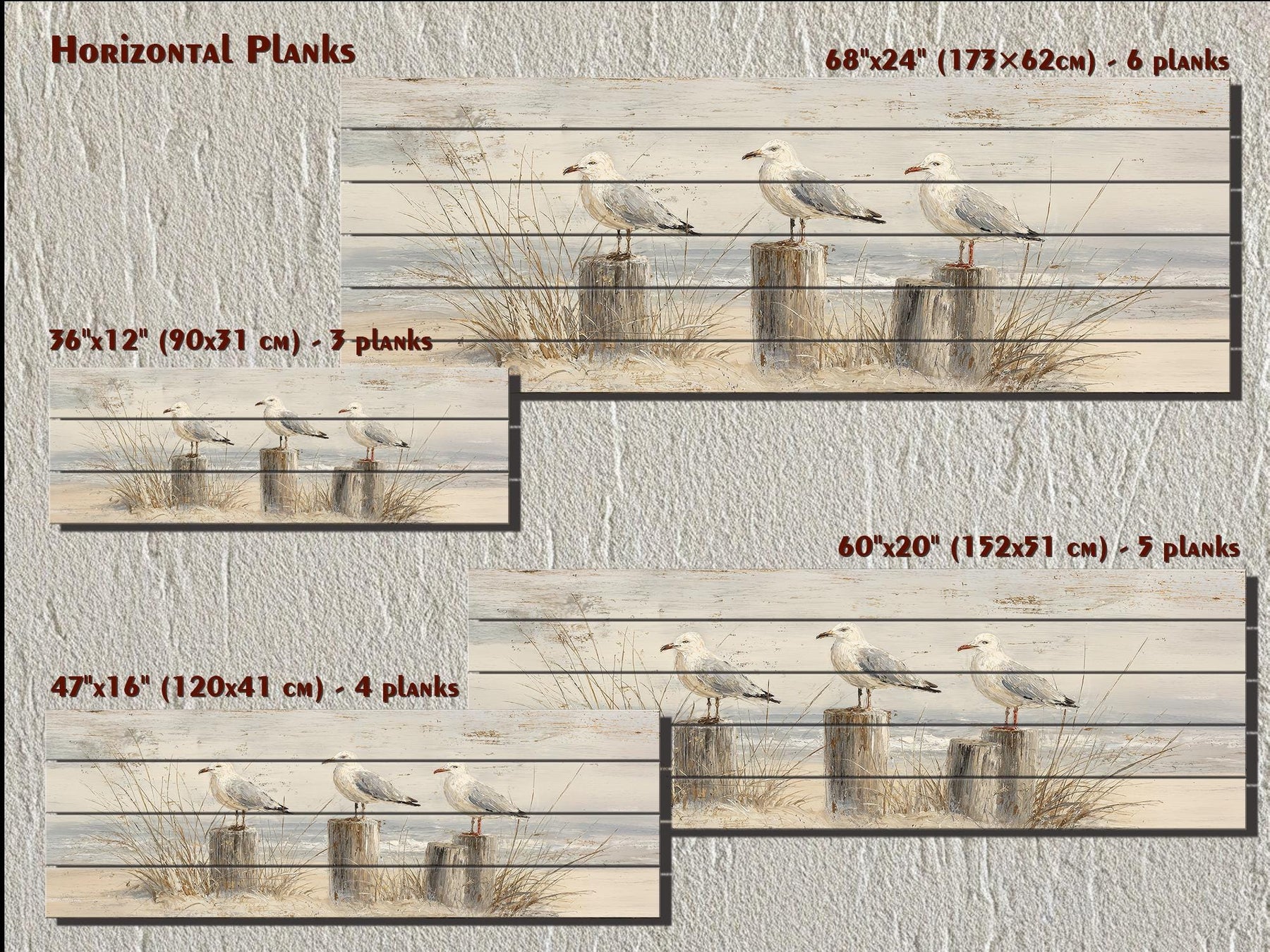 Mouettes sur poteaux de plage, grande décoration murale horizontale en bois pour maison de plage