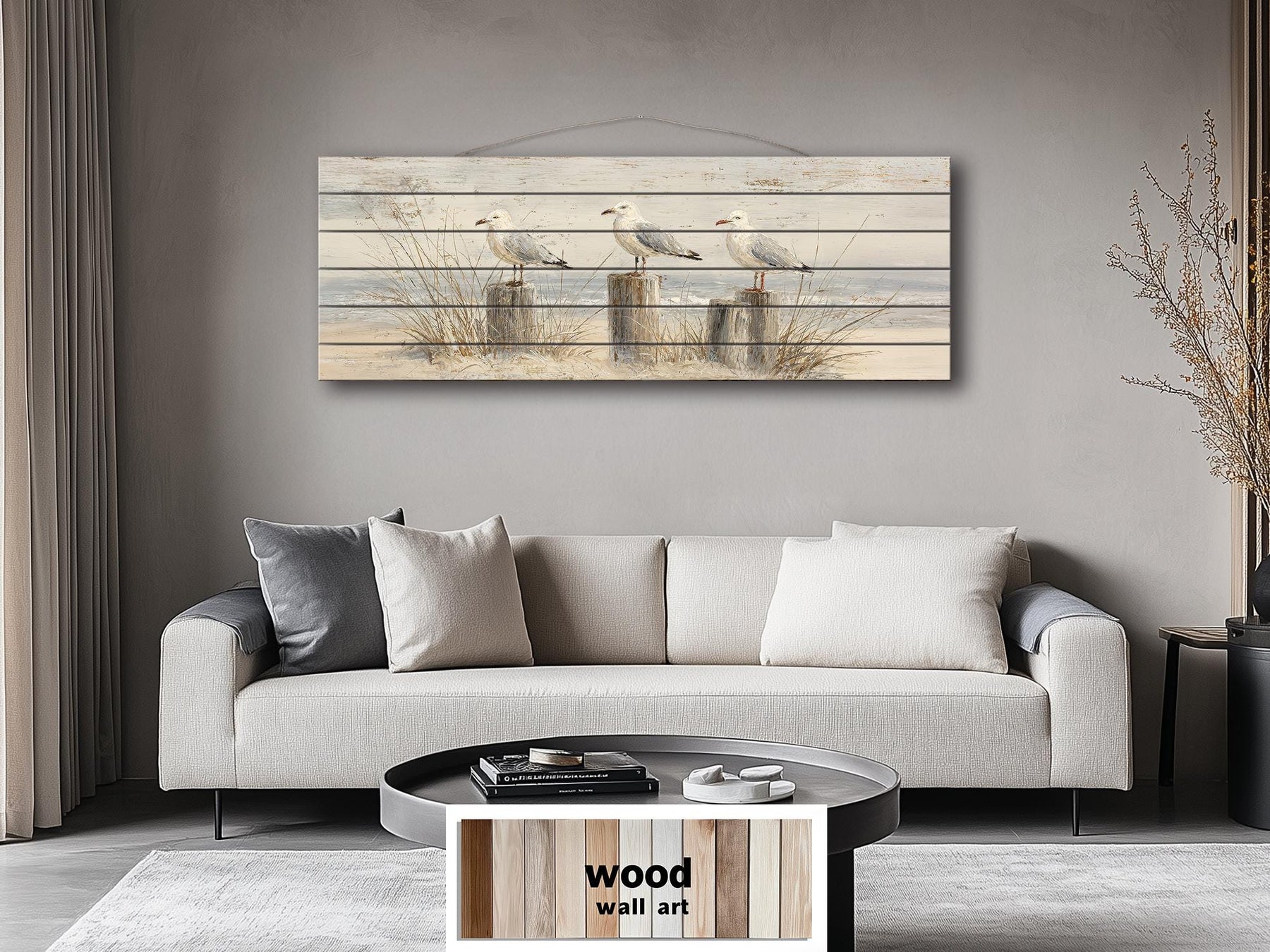 Cette œuvre d'art murale de mouettes sur des poteaux de plage tire toute sa palette de l'extrémité la plus douce et la plus paisible du spectre de couleurs côtières — une collection de blancs de bois flotté pâles, de crèmes sableuses chaudes, de gris doux et frais, et de bleus pâles et brumeux qui, ensemble, créent l'une des histoires de couleurs les plus véritablement reposantes et atmosphériquement convaincantes disponibles dans le décor côtier. Le fond du ciel et de la mer occupe les tons les plus froids de la composition — un gris-bleu pâle doux, un blanc chaud et brumeux, et des touches à peine perceptibles de mousse de mer qui se mélangent dans la brume atmosphérique d'un matin côtier calme où l'horizon est plus suggéré que clairement défini. Les poteaux de plage et les pieux introduisent des tons de sable chaud, de taupe patiné et de gris pâle de bois flotté — les couleurs exactes du bois qui a été blanchi, salé et lissé par des années d'exposition aux marées pour devenir quelque chose de plus doux et de plus beau qu'il ne l'était à l'origine. Les mouettes elles-mêmes sont représentées dans un blanc doux pur et un gris froid pâle, leur plumage discret les reliant visuellement au ciel brumeux au-dessus et aux poteaux pâles en dessous, de manière à les faire se sentir complètement natives de la composition. Le grain de bois naturel du support en planches tisse ses propres tons de miel chaud et de blond pâle à travers toute l'image, visible sous l'œuvre d'art d'une manière qui ajoute de la chaleur, de la texture et une qualité organique qui approfondit la palette côtière générale sans la perturber. Il n'y a pas de couleur saturée, audacieuse ou exigeante dans cette pièce — tout existe dans le registre calme, pâle et délavé d'un rivage vu à travers la brume marine matinale, ce qui est précisément là où le décor côtier est le plus beau et le plus en paix avec lui-même. Cette œuvre d'art de mouettes sur des poteaux de plage se marie sans effort avec le blanc, le crème, le gris doux, le bleu pâle, le lin naturel, le bois patiné, le verre de mer et la corde — le vocabulaire complet de l'intérieur côtier bien conçu. Elle se comporte magnifiquement à la lumière naturelle, où les tons pâles brillent doucement et le grain du bois prend vie, et tout aussi bien dans la lumière chaude et tamisée d'une soirée de maison de plage. La palette générale est si intrinsèquement apaisante qu'elle abaisse la température visuelle de toute pièce où elle est placée — la faisant paraître plus spacieuse, plus paisible et plus proche de la plage. C'est une qualité rare et véritablement précieuse dans toute œuvre d'art murale.