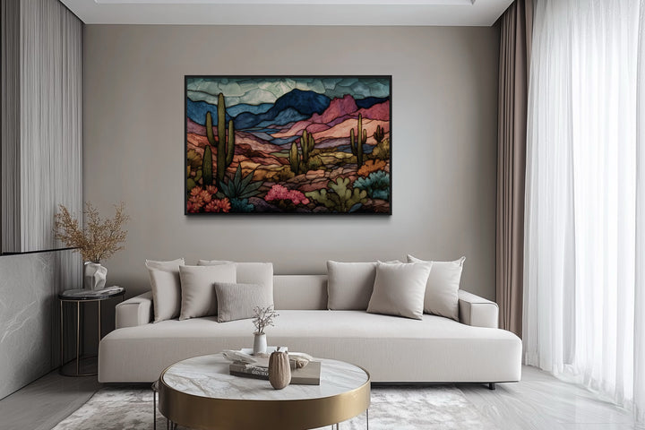 Toile encadrée mexicaine représentant un cactus Saguaro dans le désert de Sonora, dans un style vitrail