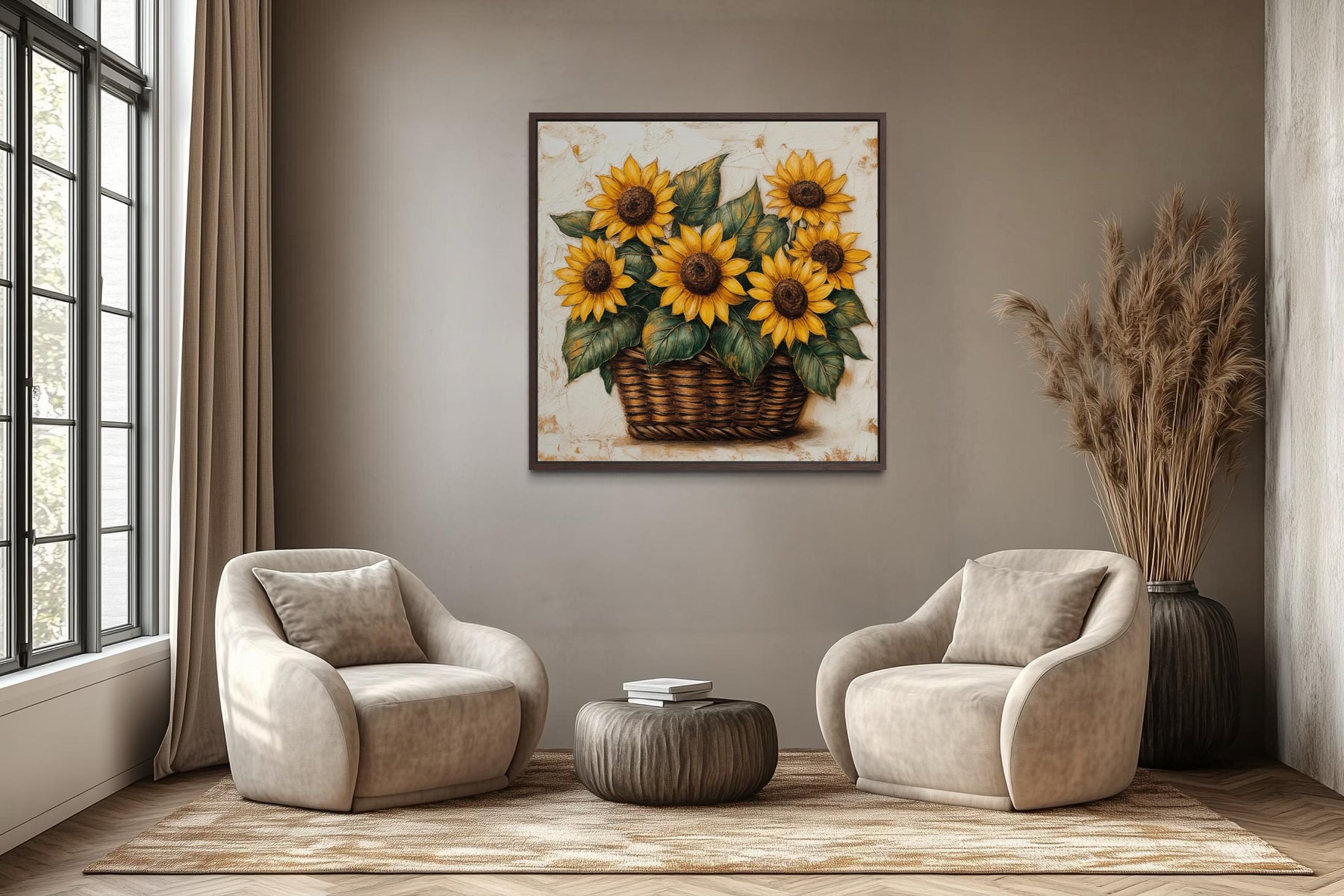 La palette de couleurs de cette décoration murale en tournesols repose sur une base de chaleur pure et joyeuse — une collection de jaunes, d'ors, de verts et d'ambres qui, ensemble, créent l'une des histoires de couleurs les plus universellement appréciées de tout l'art botanique. Les pétales de tournesol sont les stars incontestables de la palette — ils vont du jaune beurre pâle à leurs extrémités extérieures au jaune doré riche dans leurs sections médianes, jusqu'à l'ambre profond et saturé et l'or brûlé là où les pétales s'approchent du centre, donnant à chaque fleur individuelle une gamme tonale pleine et lumineuse qui semble vivante sous toutes les conditions d'éclairage. Les centres de graines de chaque fleur sont peints en brun chocolat foncé et presque noir, créant le genre de point focal à contraste élevé qui attire le regard et donne au bouquet entier un sentiment de profondeur et de structure visuelle que les peintures plus libres manquent souvent. Les feuilles introduisent un spectre complet de verts — du vert printanier vif et frais là où la lumière capte les surfaces supérieures des feuilles au vert olive profond et vert forêt dans les dessous ombragés et les bords recourbés, donnant à l'arrangement une qualité naturelle et fraîche de jardin. Le panier en osier apporte des tons chauds de miel, de caramel écossais et de beige qui ancrent le bas de la composition dans une richesse terreuse, reliant les tournesols au-dessus à un sentiment de sol et de stabilité sans détourner l'attention des fleurs. L'arrière-plan est délibérément discret — un ton doux, chaud, blanc cassé à crème pâle qui fonctionne comme le parfait faire-valoir neutre pour laisser chaque couleur du premier plan chanter aussi fort et librement qu'elle le souhaite. Il n'y a pas une seule couleur froide ou dissonante nulle part dans cette composition — chaque ton existe dans la moitié chaude du spectre, créant un effet global qui est véritablement ensoleillé, stimulant et émotionnellement généreux. L'impression sur toile de tournesols se lit comme lumineuse et joyeuse à la lumière du jour naturelle, et se transforme en quelque chose de plus chaud et intime sous la lumière d'une lampe ou d'une bougie — ce qui en fait une pièce qui change subtilement avec l'heure de la journée. Globalement, cette palette fonctionne magnifiquement avec du lin crème, du bois chaud, de la terre cuite douce, du laiton vieilli et des tons bleu-gris doux qui sont la marque des intérieurs de ferme et de cottage bien conçus. Si votre maison raconte son histoire dans le langage de la chaleur, de la beauté naturelle et d'une profonde appréciation des plaisirs simples de la campagne, cette histoire de couleurs a sa place sur votre mur.