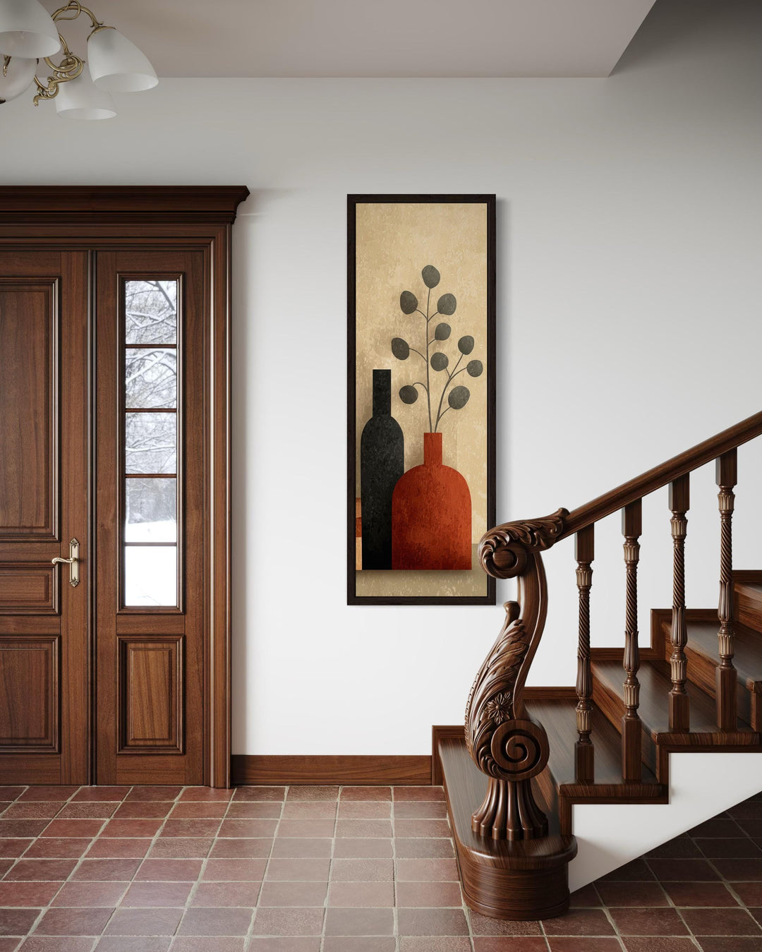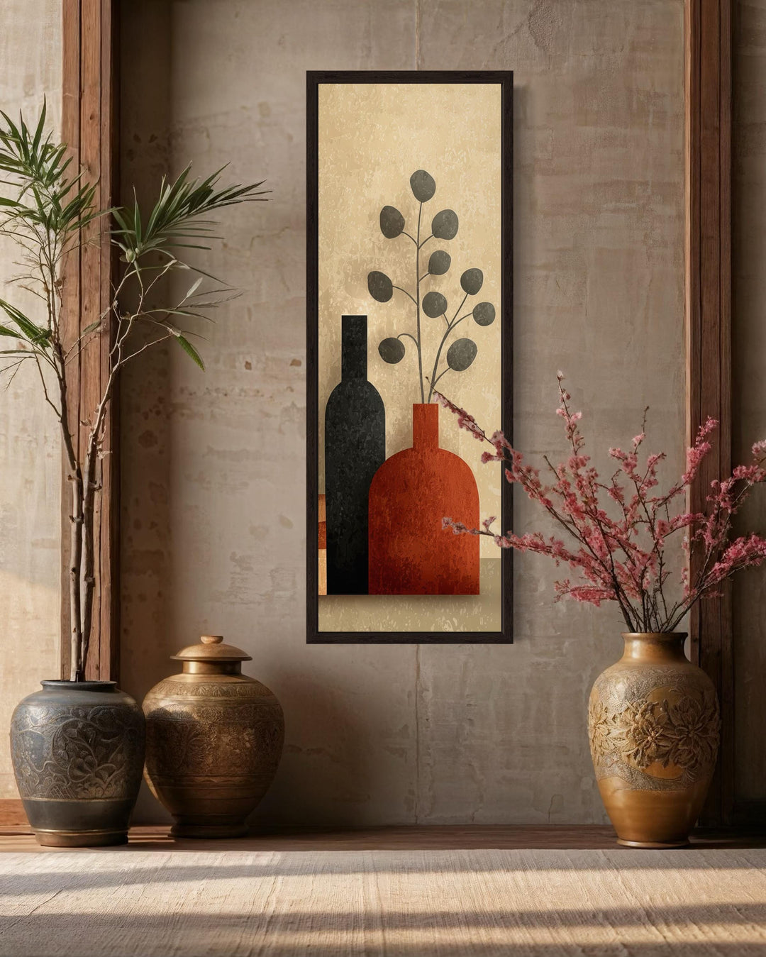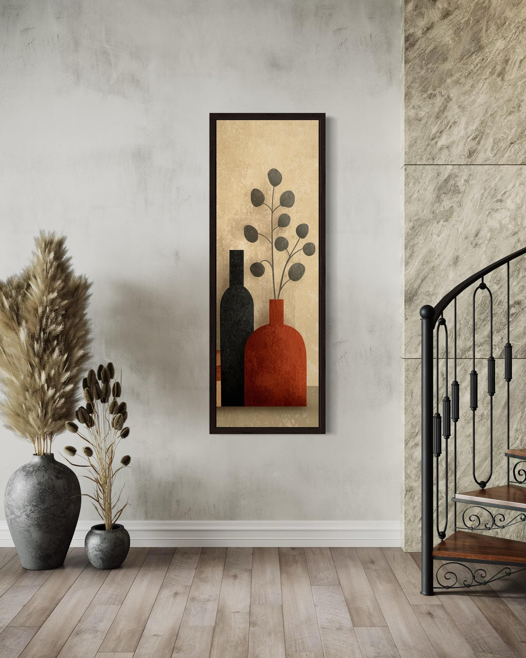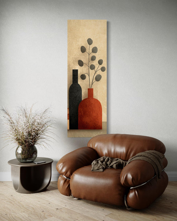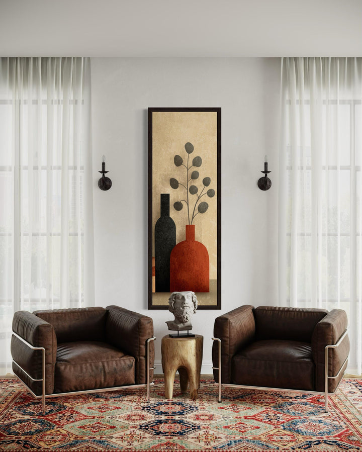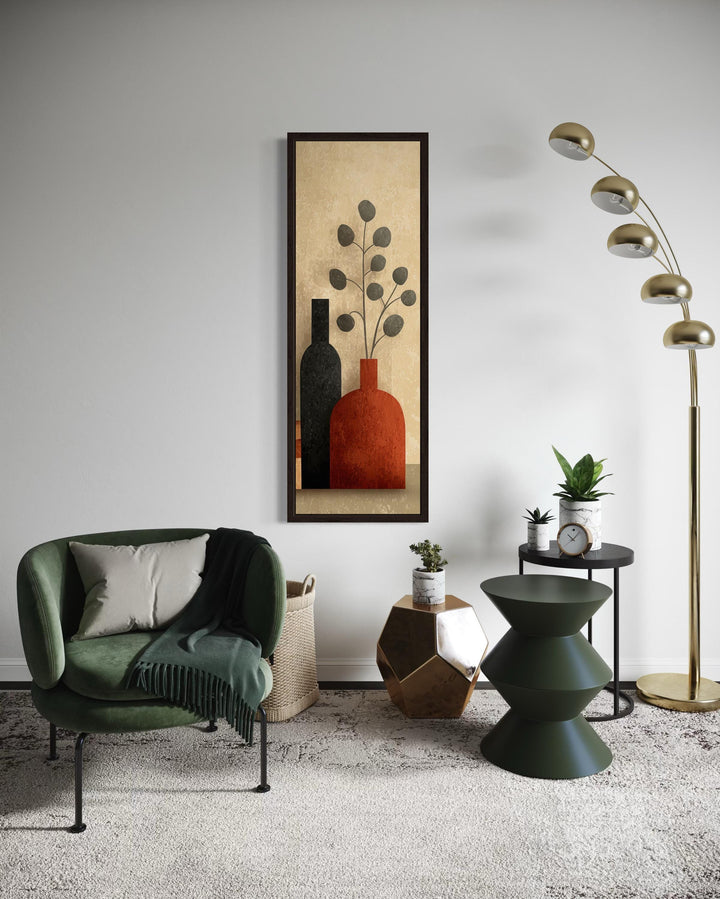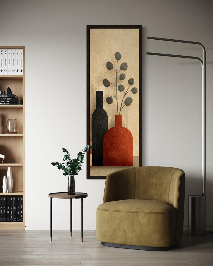 Cette toile verticale est idéale pour les maisons modernes aux murs hauts et étroits nécessitant une structure élégante, notamment les entrées, les cages d'escalier ou les passages de portes. Elle s'épanouit dans les espaces au design Mid-Century, mais s'intègre aussi parfaitement aux intérieurs scandinaves, bohèmes ou transitionnels qui privilégient les formes épurées et les couleurs subtiles. Avec ses tons chauds et sa disposition verticale, l'impression attire le regard vers le haut, ajoutant de la hauteur et de la présence visuelles sans être dominante ni criarde. Placez-la dans un couloir avec une peinture murale douce et des touches de bois, ou installez-la dans un coin lecture confortable au-dessus d'un banc pour créer un point focal accueillant. L'œuvre s'associe parfaitement à la céramique, aux tissus texturés et au mobilier aux couleurs neutres, offrant une présence naturelle et réfléchie. Même dans les intérieurs plus contemporains, elle apporte douceur et équilibre lorsqu'elle est entourée de luminaires métalliques ou de meubles aux lignes épurées. Loin d'être encombrée, elle peut également servir de point de repos visuel dans les murs de galeries ou les espaces ouverts partagés. Sa hauteur la rend particulièrement utile dans les aménagements où l'œuvre occupe davantage la hauteur que la largeur. Avec simplicité, forme et chaleur, peu de pièces apportent un charme vertical comme nos grands vases étroits du milieu du siècle.
