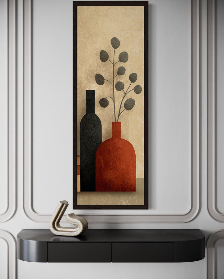 Notre décoration murale de vases hauts et étroits du milieu du siècle apporte chaleur, symétrie et une esthétique moderne et épurée à votre espace grâce à une toile encadrée verticalement, conçue pour les murs étroits et élégants. L'œuvre représente un vase en terre cuite audacieux en bas au centre, d'où s'élèvent des feuilles et des tiges minimalistes en un rythme doux vers le haut de la composition. Chaque forme botanique est représentée dans des couleurs douces du milieu du siècle, notamment l'orange argile, l'ocre et le rouille discret, flottant vers le haut sur un fond neutre et riche. La disposition générale est nette et verticale, avec des formes simplifiées et des espaces négatifs créant harmonie et respirabilité. Cette toile représentant un vase n'est pas peinte à la main, mais imprimée avec une clarté exceptionnelle et une texture subtile, lui conférant l'aspect d'une impression moderne soigneusement réalisée. Les lignes douces et géométriques évitent l'encombrement tout en créant une structure et une sensation de calme. Encadrée et prête à accrocher, cette grande toile est idéale pour les espaces qui recherchent un équilibre visuel vertical sans sacrifier le style. Des couloirs et entrées aux coins de chambre et aux murs transitionnels, sa forme lui permet de s'imposer là où les œuvres d'art de taille standard ne le peuvent pas. Rehaussez les espaces étroits sans effort avec le flux gracieux et l'équilibre vertical de nos grands vases étroits du milieu du siècle.