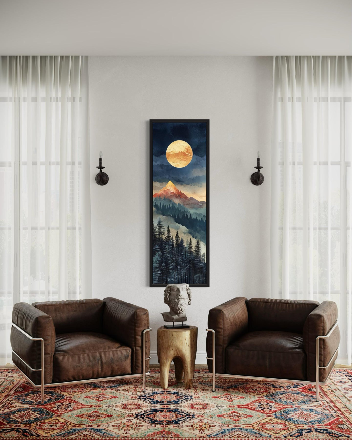 L'œuvre murale « Montagnes et pleine lune verticales étroites » est idéale pour les cabanes rustiques ou les salons d'inspiration nature qui célèbrent les nuits paisibles de la nature sauvage. Dans une cabane de montagne, elle fait écho à la grandeur paisible qui se trouve juste au-delà des murs, complétant les poutres en bois, les cheminées en pierre et les textures naturelles douces. Dans un salon sur le thème de la nature, elle sert de point focal spectaculaire, s'accordant parfaitement avec des meubles aux tons terre et des textiles tissés doux. Son format allongé la rend parfaite pour les murs étroits, les entrées hautes ou les espaces à côté des grandes fenêtres, attirant le regard vers le haut et rehaussant les dimensions verticales. Ses bleus riches et ses gris subtils se fondent parfaitement avec les matériaux naturels comme le bois et la pierre, renforçant le sentiment de connexion avec l'extérieur. Que ce soit au-dessus d'un coin lecture, à côté d'une cheminée rustique ou dans un couloir calme, ce paysage de pleine lune apporte un calme durable et un drame subtil. Il plaît à ceux qui aiment les randonnées nocturnes, les nuits étoilées ou la beauté paisible des paysages alpins. Avec sa fabrication sur toile de première qualité et sa facilité de suspension, l'impression sur toile « Montagnes et pleine lune verticales étroites » reste un élément durable de la maison d'un amoureux de la nature. Terminant en élégance tranquille, cette œuvre murale « Montagnes et pleine lune verticales étroites » apporte le mystère poétique des sommets éclairés par la lune à l'intérieur.