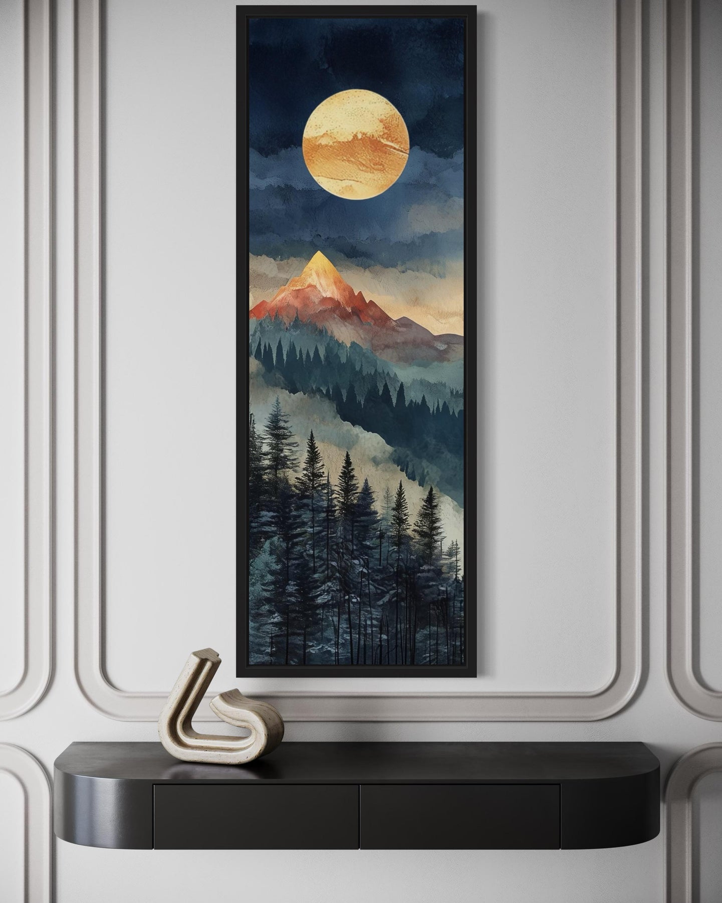 Le tableau vertical étroit représentant une montagne et une pleine lune brille d'une palette de teintes profondes et dramatiques, subtilement équilibrées avec des reflets délicats. Un indigo riche et un bleu minuit offrent un arrière-plan mystérieux, tandis que des couches de gris doux et de couleur ardoise créent l'illusion de chaînes de montagnes lointaines. Des verts de forêt frais accentuent les silhouettes des pins, ancrant la composition dans une force naturelle. La pleine lune elle-même rayonne d'un crème pâle et d'un argent doux, accentués de légères touches d'or chaud qui imitent la chaleur subtile de la lumière lunaire. Des nuances de lavande douce et de prune poussiéreuse dérivent à travers les nuages, leur donnant un éclat délicat et pourtant multidimensionnel. Le contraste entre le paysage sombre et le ciel lumineux crée un jeu captivant de lumière et d'ombre. Chaque transition de couleur est finement mélangée pour évoquer les textures douces d'une nuit paisible, garantissant que la toile reste visuellement riche sous tous les angles. Tant à la lumière naturelle du jour qu'à une douce lumière intérieure, le tableau conserve sa profondeur dramatique et son éclat discret. L'effet global est à la fois paisible et saisissant, faisant de ce tableau sur toile vertical étroit représentant une montagne et une pleine lune une œuvre durable de couleur et d'atmosphère. Avec son élégance subtile et ses tons stratifiés, cet artwork représentant une montagne illuminée par la lune offre un festin visuel intemporel.