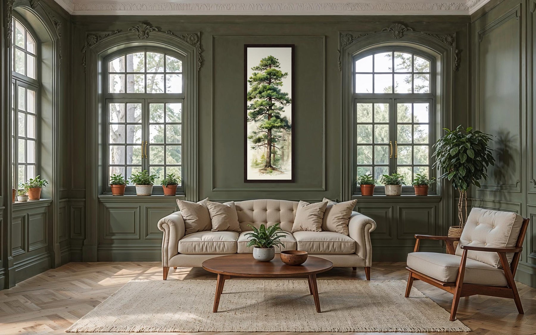 Le tableau vertical étroit « Grand Pin » est composé de verts doux, de bruns terreux et de teintes neutres délicates qui créent une harmonie naturelle et rafraîchissante. Des verts forêt et mousse profonds donnent vie aux aiguilles de pin, tandis que des bruns riches et des gris subtils ajoutent de la texture et de la profondeur au tronc. Des blancs légers et vaporeux et des gris ciel délicats évoquent le brouillard matinal, créant un arrière-plan calme qui souligne la présence imposante du pin. Des tons olive doux et sauge pâle se fondent discrètement dans les silhouettes de la forêt environnante, offrant un environnement réaliste et en plusieurs couches. Des touches chaudes de beige et d'or pâle apparaissent là où la lumière du soleil filtre, apportant une douceur chaleureuse à la palette fraîche de la forêt. Le résultat est un arrangement de couleurs équilibré et apaisant, qui reste vibrant et paisible à la lumière du jour ou à l'éclairage intérieur. Des transitions soigneusement mélangées entre les teintes créent un sentiment naturel de profondeur et de perspective. Ces tons rendent l'œuvre murale sur toile « Grand Pin » facile à coordonner avec des intérieurs neutres ou à accents de bois. Chaque couleur a été choisie pour exprimer le calme, la force et le caractère intemporel des bois à feuilles persistantes. Avec sa palette riche mais subtile, le tableau « Grand Pin » procure une tranquillité visuelle et émotionnelle durable.