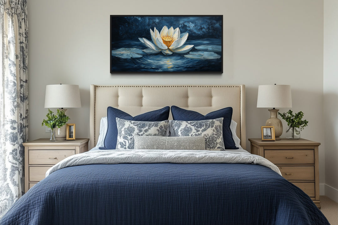 Le fond bleu marine spectaculaire de cette toile imprimée met en valeur les tons blancs doux de la fleur de lotus, créant un contraste accrocheur. Des accents subtils d'or et de gris ajoutent de la profondeur et du raffinement, rehaussant l'harmonie visuelle de la pièce. Cette palette soigneusement choisie évoque un sentiment de calme et de sérénité, ce qui la rend idéale pour les espaces de méditation ou de relaxation. Les tons riches sont suffisamment polyvalents pour s'associer à une variété de combinaisons de couleurs, des meubles neutres aux accents de décoration vibrants. Cet équilibre entre la lumière et l'obscurité garantit que l'œuvre d'art se démarque tout en se fondant sans effort dans votre décoration intérieure existante. La palette de couleurs est encore rehaussée par le cadrage élégant, qui ajoute une touche moderne à cette esthétique intemporelle. Qu'elle soit exposée dans un coin de lecture tranquille ou comme pièce maîtresse dans un salon, les teintes créent une ambiance accueillante. Cette œuvre d'art murale à fleur de lotus blanche transforme n'importe quelle pièce en un sanctuaire tranquille.