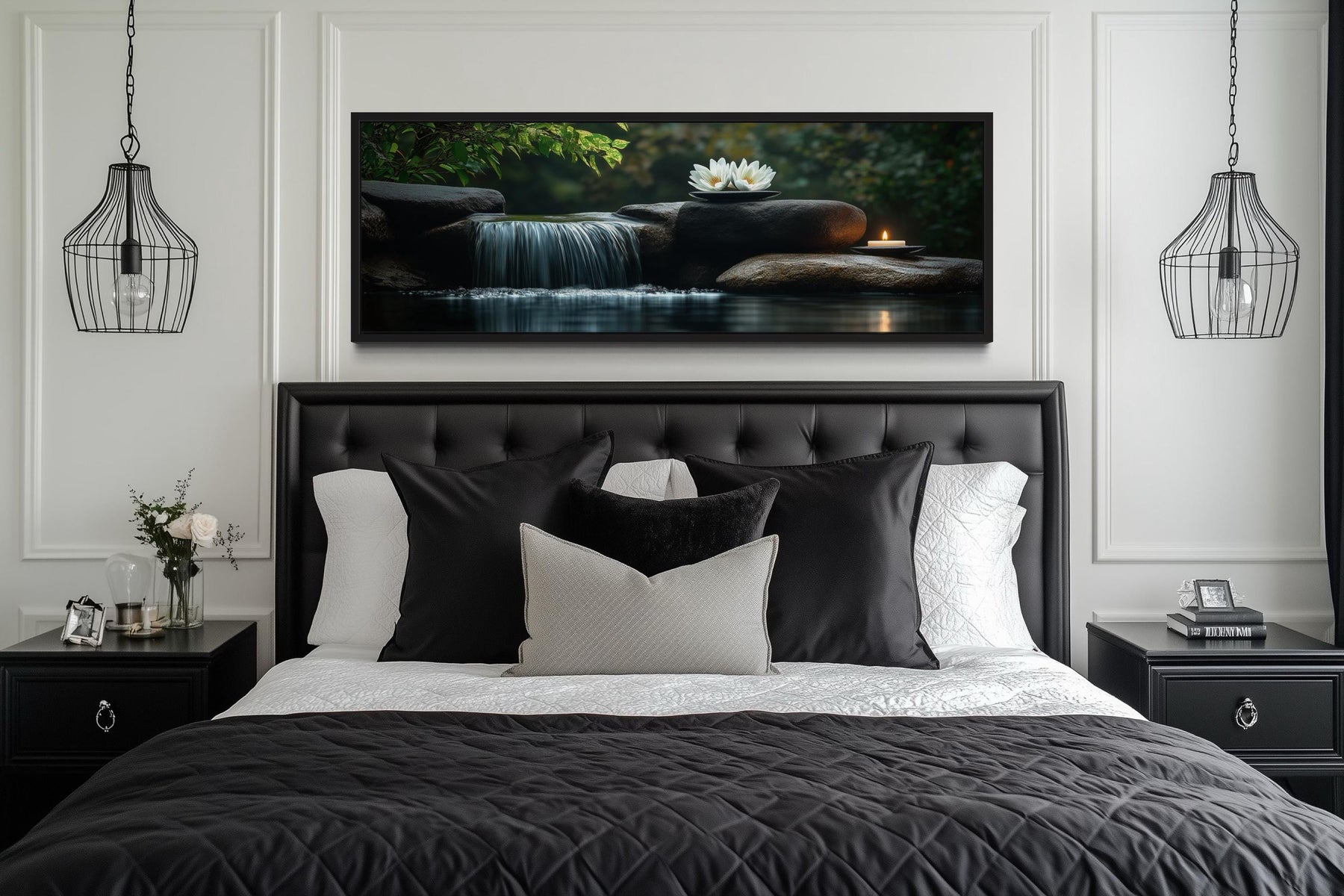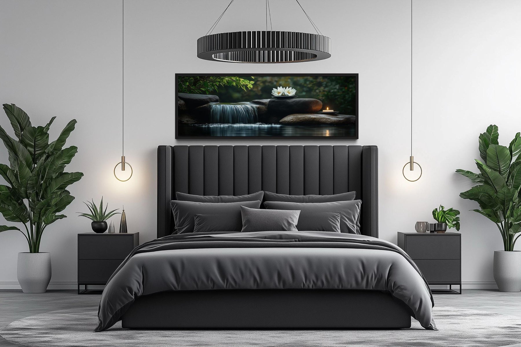 Cette décoration murale représentant un spa zen évoque une ambiance apaisante, propice à l'expiration profonde et au calme mental. Elle met en scène une cascade sereine, une bougie allumée et une fleur de lotus blanche, dans une harmonie paisible. La composition du tableau, à la fois luxueuse et apaisante, offre une évasion visuelle reflétant les rituels de repos et de pleine conscience. La présence de la flamme chaude de la bougie sur l'eau calme suggère le recentrage spirituel et le rythme intemporel de la nature. Cette toile représentant un spa zen allie les éléments d'un havre de paix à un design raffiné et moderne, qui s'intègre parfaitement aux chambres paisibles et aux espaces bien-être. La cascade en arrière-plan symbolise la purification et le renouveau émotionnels, tandis que le lotus immobile flotte, symbole de paix et de clarté. Chaque détail, des pierres noires lisses à la lumière ambiante tamisée, est choisi pour réduire le stress et favoriser une sensation de calme méditatif. Son grand format horizontal est idéal pour les têtes de lit, les spas ou les studios de massothérapie souhaitant cultiver une expérience immersive. Ce tableau représentant un spa zen n'est pas seulement décoratif ; il est un point focal d'intention et de ressourcement. L'esthétique globale de l'art mural du spa du jardin zen ressemble à une bouffée d'air frais sous forme visuelle.