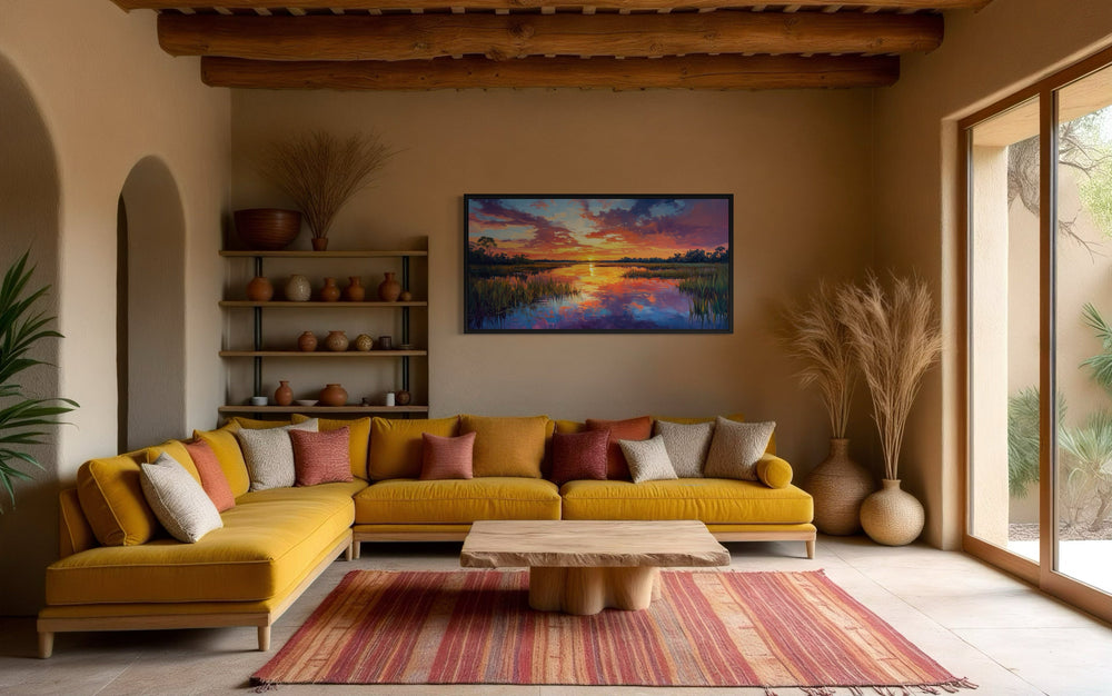 Rehaussez la décoration de votre maison avec notre superbe collection de grandes toiles murales représentant des couchers de soleil. Ces pièces captivantes présentent une variété de paysages baignés dans les teintes dorées du coucher de soleil, notamment des représentations photoréalistes, des montagnes majestueuses, des plages sereines, des lacs tranquilles et des forêts denses. Chaque pièce est méticuleusement conçue pour apporter chaleur et tranquillité à votre espace de vie, créant un point focal visuellement frappant qui captive et apaise. L'art détaillé et les couleurs riches de ces peintures de coucher de soleil créent une atmosphère accueillante, rendant n'importe quelle pièce plus accueillante et sereine. De la lueur subtile d'un coucher de soleil sur une forêt tranquille à l'éclat vibrant de couleurs sur un océan calme, ces pièces capturent l'essence des moments les plus époustouflants de la nature.