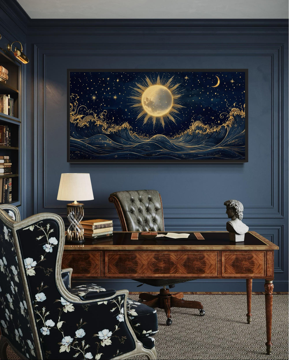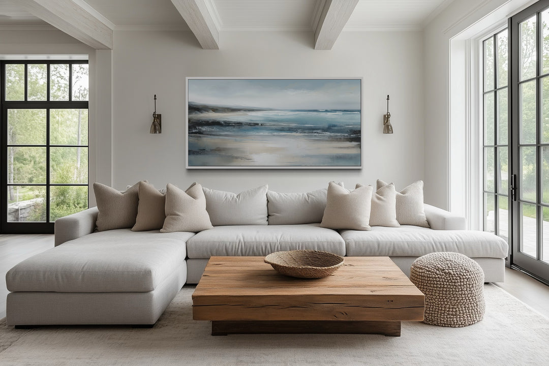 Nos tableaux océaniques extra larges sont conçus pour compléter une large gamme de styles d'intérieur, des maisons minimalistes modernes aux chalets côtiers confortables. Les bleus apaisants et les compositions dynamiques apportent un sentiment de paix et de mouvement, créant un point focal qui attire le regard et apaise l'esprit. Imaginez une scène océanique sereine suspendue au-dessus de votre lit, transformant votre chambre en un refuge reposant. Ou imaginez une peinture océanique abstraite et vibrante dans votre bureau, inspirant la créativité et offrant une toile de fond apaisante pour votre journée de travail.