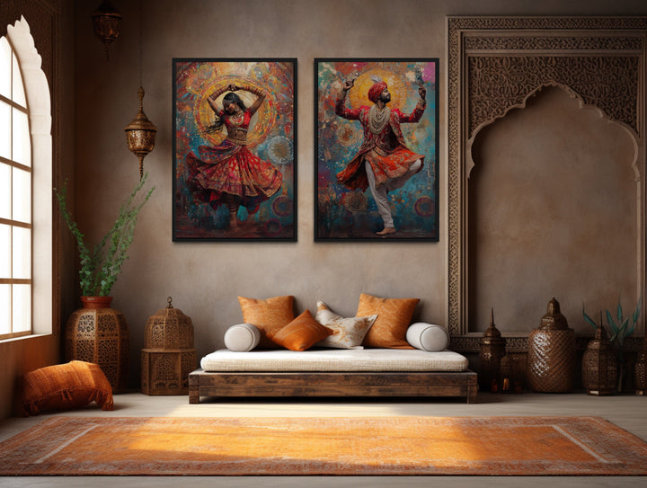 Toile encadrée représentant un homme et une femme indiens en train de danser, 2 pièces