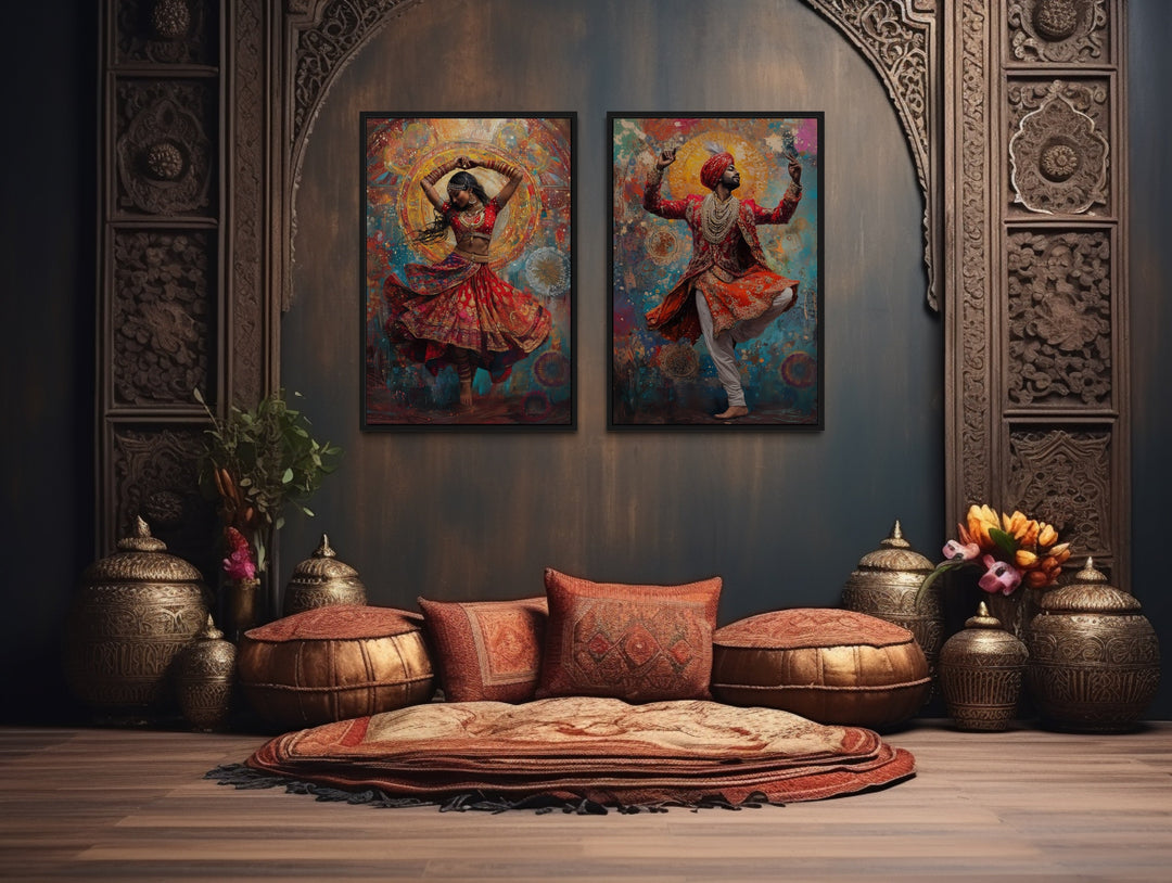 Les couleurs de cet ensemble d'impressions sur toile de danse sont audacieuses et chaleureuses, faisant écho au dynamisme de la culture indienne. Des rouges riches, des oranges profonds et des touches subtiles d'or remplissent l'arrière-plan, contrastant magnifiquement avec la tenue des personnages. Les vêtements des danseurs sont peints dans des tons de bleu, de vert et de rouge, mettant l'accent sur leurs mouvements expressifs. Ces tons chauds rendent l'œuvre d'art accueillante, ajoutant une touche d'énergie et de chaleur à n'importe quelle pièce. Les choix de couleurs abstraites amplifient le sens du mouvement et du rythme, parfaits pour créer une ambiance engageante. Cette palette de couleurs s'adapte bien à un décor de couleur terreuse ou neutre, ajoutant un point focal qui illumine la pièce. Chaque nuance de cet ensemble d'art mural de danse indienne est soigneusement choisie pour mettre en valeur l'authenticité culturelle et la chaleur de la danse.