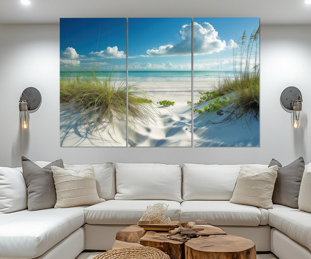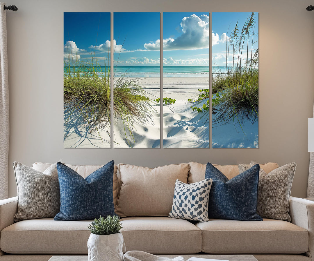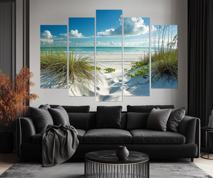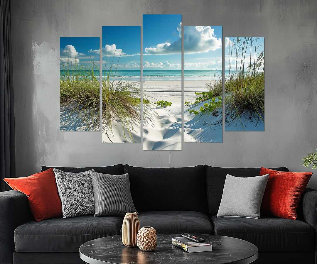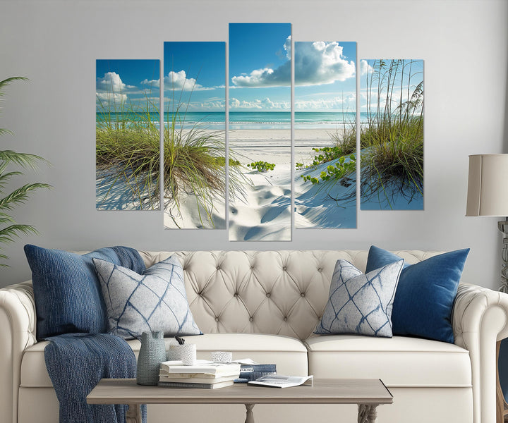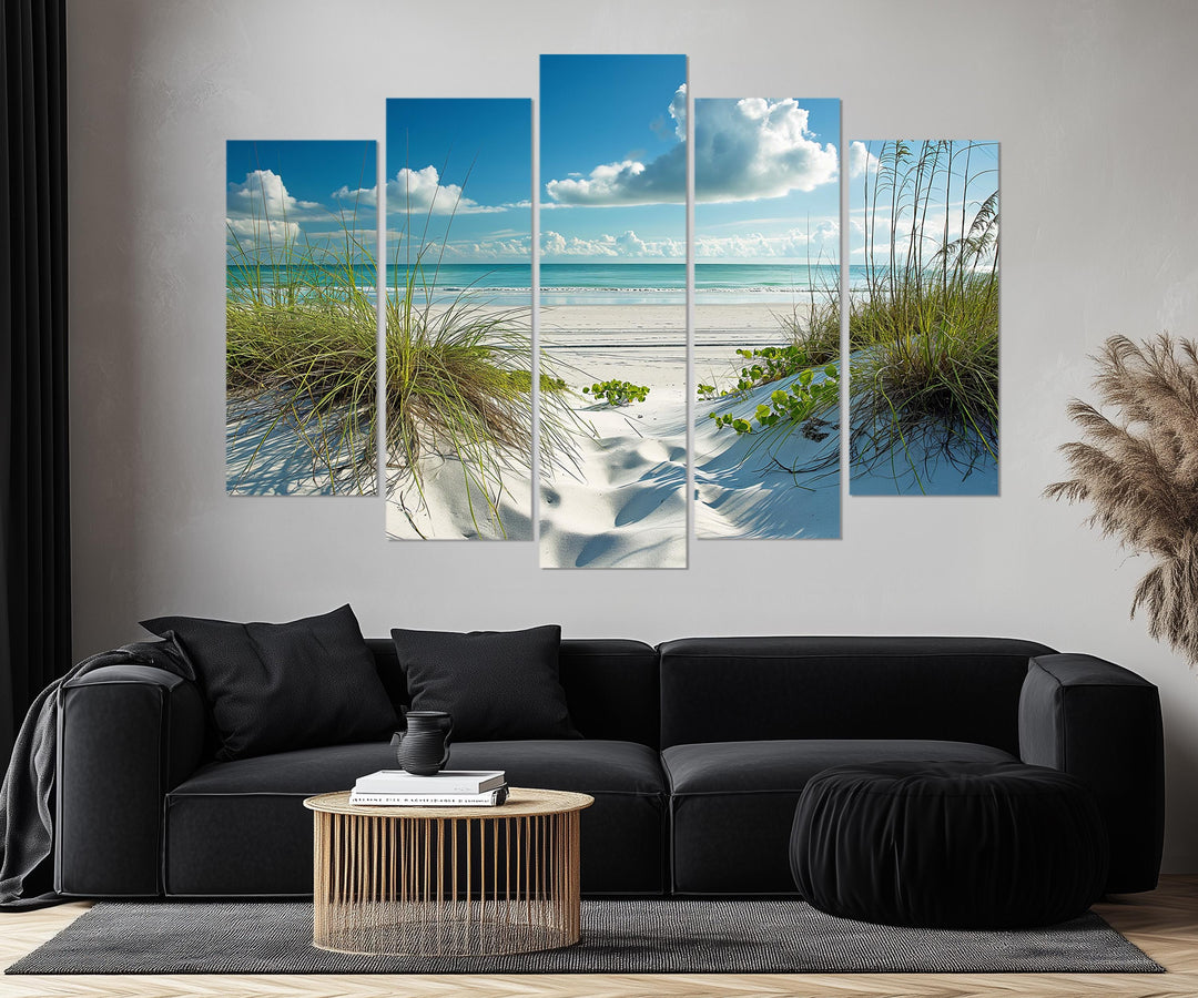 Décoration murale en 5 pièces représentant une plage de sable blanc et des dunes d'herbes marines