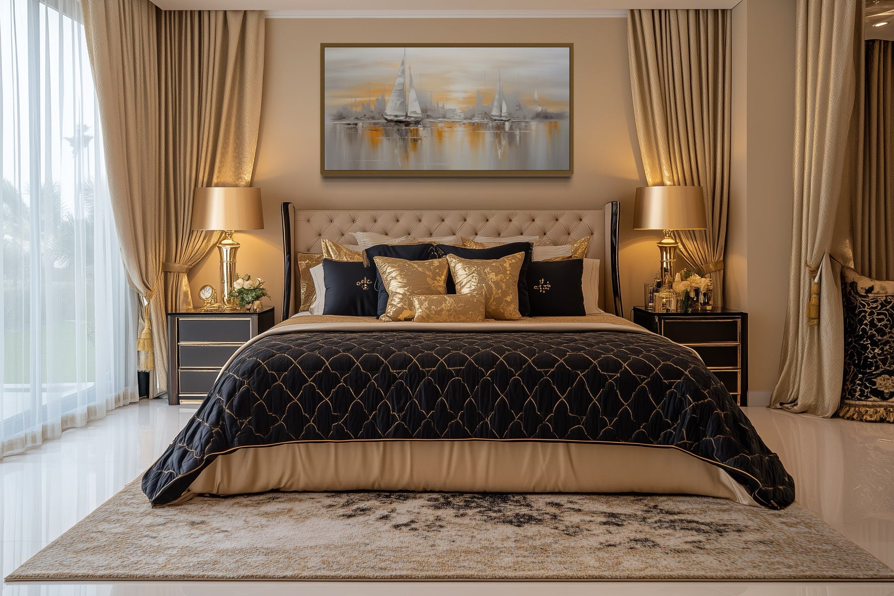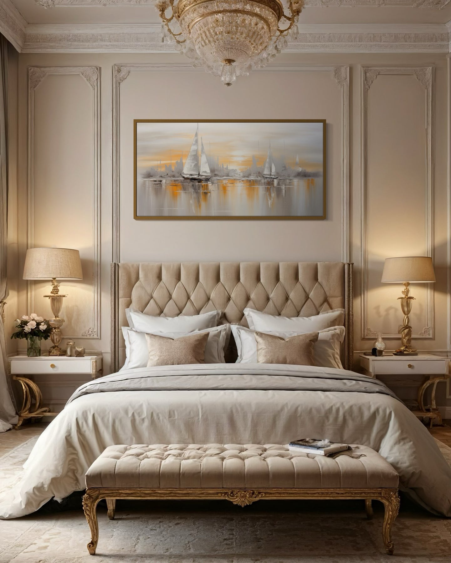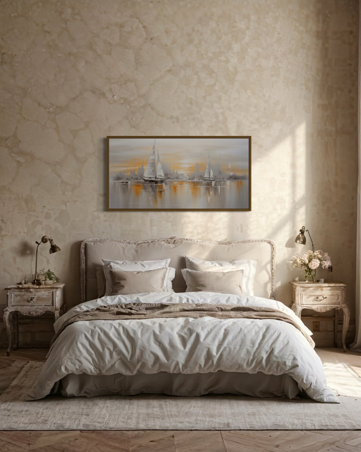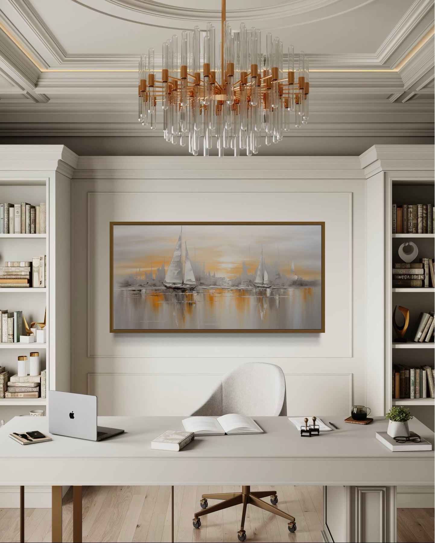 La palette de couleurs de ce tableau abstrait de voiliers présente un mélange raffiné d'argent chatoyant, d'or radieux et de tons gris doux. Ces teintes évoquent les reflets tranquilles de l'eau et du ciel, apportant une ambiance côtière sereine à votre espace. Les reflets métalliques des voiliers contrastent magnifiquement avec le fond atténué, créant une profondeur visuelle et un point focal saisissant. Des dégradés et des ombres subtils ajoutent du mouvement à la composition, renforçant son esthétique moderne et dynamique. Les tons argent et or fonctionnent harmonieusement, ce qui rend cette pièce polyvalente pour une variété de styles de décoration, du côtier au minimaliste. Les gris atténués ancrent le design, équilibrant les accents métalliques et soulignant le charme sophistiqué de l'œuvre d'art. Cette utilisation élégante de la couleur garantit que le tableau de voiliers se démarque dans n'importe quel décor, offrant à la fois chaleur et touche contemporaine. Apportez harmonie et intrigue visuelle à votre pièce avec ce tableau abstrait de voiliers.