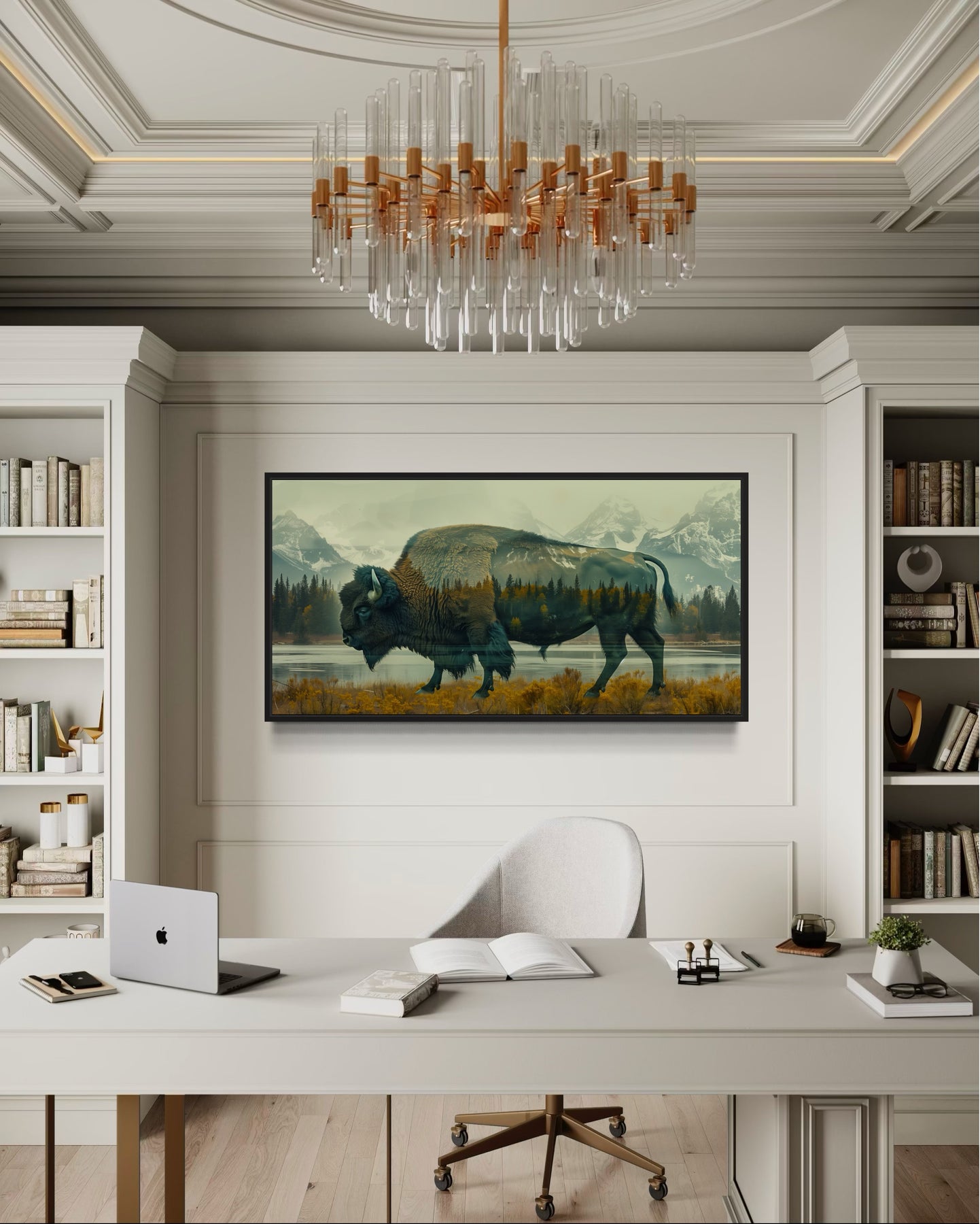 Notre toile encadrée à double exposition représentant un bison d'Amérique et Yellowstone allie magnifiquement la majesté de la faune sauvage à l'attrait serein des paysages naturels. Cette superbe œuvre d'art présente un bison superposé à une scène époustouflante des montagnes et des forêts de Yellowstone, créant un effet de double exposition unique qui capture l'esprit de la nature sauvage. La composition audacieuse met en valeur la robustesse du bison tout en intégrant harmonieusement la beauté tranquille de son habitat. Cette interprétation contemporaine de l'art rustique en fait une pièce remarquable pour n'importe quelle maison. Les détails fins et le mélange harmonieux de la faune et du paysage évoquent un lien profond avec la nature. Encadrée de manière experte, cette toile ajoute une touche raffinée à son attrait rustique, la rendant idéale pour les intérieurs modernes avec un thème inspiré de la nature. Apportez la beauté sauvage des plaines américaines à votre espace avec cette toile encadrée à double exposition captivante représentant un bison d'Amérique et Yellowstone.