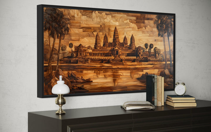 Cette peinture de temple cambodgien baigne dans des tons chauds et naturels : bruns dorés, ambres profonds, orange rustique et sépia profond donnent vie à l'ancienne structure. Le ciel s'illumine d'un doux dégradé de pêche, de sable et de bronze bruni, tandis que les reflets de l'eau en contrebas créent des ombres plus froides aux nuances subtiles de charbon de bois et d'ardoise. Des touches de vert délavé provenant des palmiers tropicaux contrastent délicatement avec la chaleur dominante, ancrant l'œuvre dans un équilibre naturel. La finition effet bois adoucit les transitions et confère aux couleurs un aspect vieilli et organique. Ces couleurs s'accordent à merveille avec du mobilier en rotin, en bambou, en teck ou en bois foncé, notamment dans les intérieurs aux tons chauds ou d'inspiration internationale. La palette évoque le lever du soleil, la fumée d'encens et le silence matinal d'un lieu sacré. Chaque ton semble choisi avec intention : riche mais sobre, terreux mais spirituel. Cette œuvre d'art murale d'Angkor Wat apporte de l'harmonie à tout espace grâce à sa palette chaleureuse et réfléchissante.