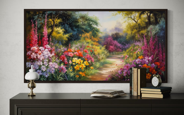Toile encadrée colorée représentant un jardin de fleurs antique