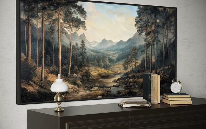 Cette estampe vintage représentant une forêt de montagne est composée d'une palette profonde et harmonieuse qui reflète la nature sous une lumière classique, avec une richesse tamisée et une subtilité superposée. Des verts terreux, des ocres chauds et des bruns adoucis dominent le premier plan forestier, tandis que les sommets lointains sont rendus par des bleus-gris froids qui se fondent doucement dans la brume. Le ciel est un mélange de crème doré et de bleu délavé, comme filtré par la douce brume de fin d'après-midi ou les premières lueurs du matin. Les arbres plus proches du spectateur sont ombragés de verts foncés et de tons olive ombragés, tandis que ceux au loin se fondent dans des couches de bleu fumé et de sauge douce. L'eau reflète une palette douce et sombre : argent poussiéreux, lumière ambrée et tons forestiers mêlés à un mouvement délicat. La composition entière évite les contrastes prononcés, privilégiant une gamme tonale évoquant une vieille huile sur toile et l'érosion silencieuse du temps. Une lumière dorée effleure les collines et l'écorce, donnant vie aux arbres sans occulter l'effet antique. Le mélange de couleurs est naturel, pictural et parfaitement en harmonie avec l'atmosphère historique, évoquant l'art d'antan et les paysages imaginés par les premiers peintres américains. Cette toile murale représentant un paysage de montagne antique utilise sa palette vintage chaleureuse pour apporter calme, authenticité et majesté tranquille à n'importe quelle pièce.