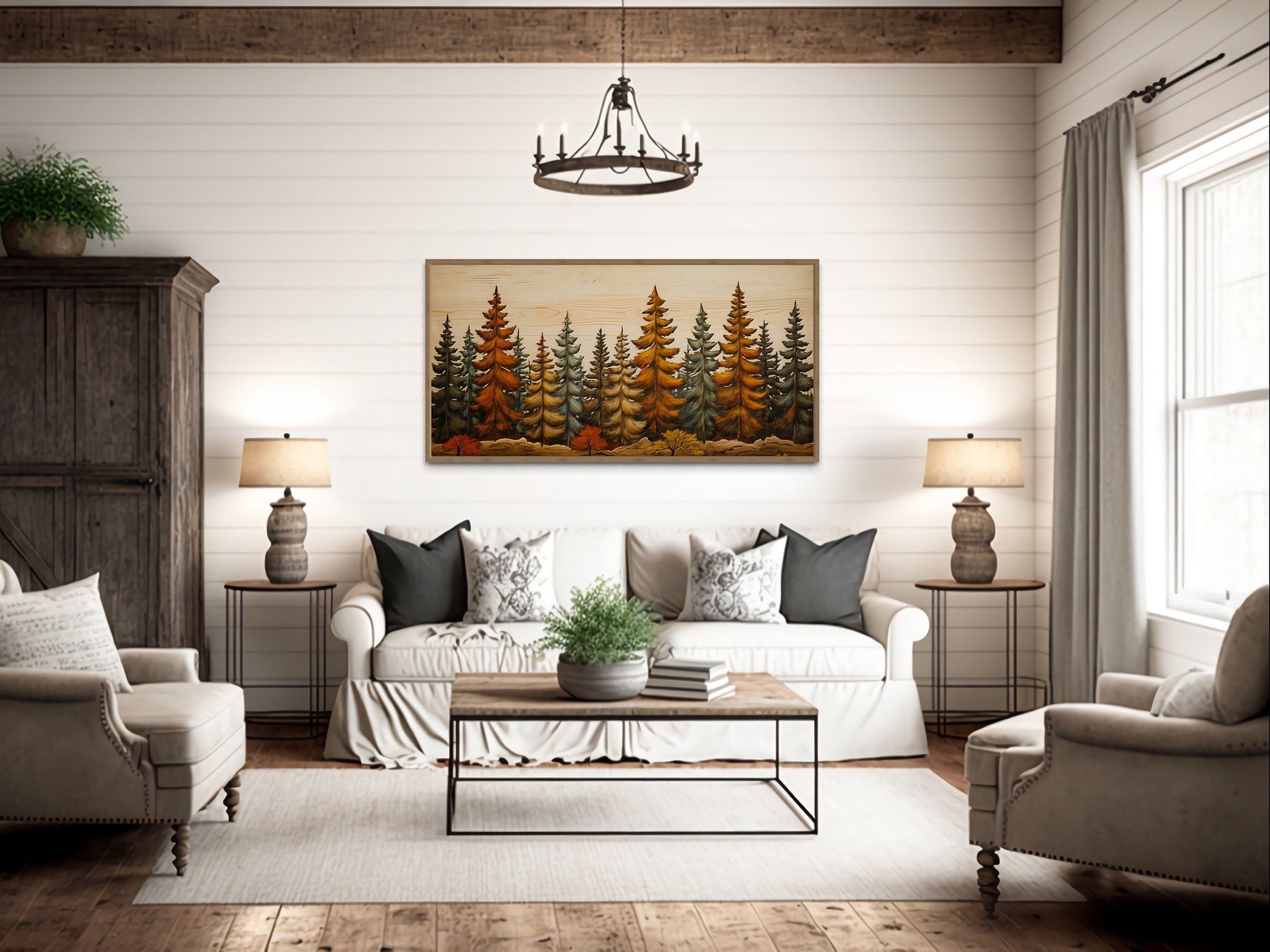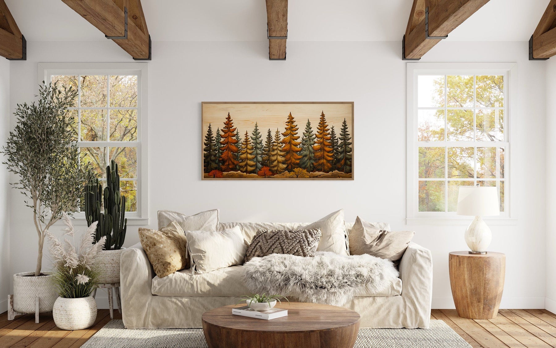 Cette peinture de forêt de sapins d'automne est un ajout idéal aux maisons qui adoptent une décoration rustique, de cabane ou inspirée de la nature. Ses couleurs chaudes et terreuses et son thème naturel en font un choix parfait pour les salons, les chambres ou tout espace qui cherche à créer une atmosphère chaleureuse et accueillante. Accrochez-la au-dessus d'une cheminée pour rehausser la chaleur de la pièce, ou placez-la dans un couloir où elle pourra accueillir les invités avec sa présence sereine et accueillante. Le charme rustique de l'œuvre d'art la rend également adaptée à une cabane ou à une maison de vacances, où sa représentation de la forêt peut compléter la beauté naturelle environnante. Que vous décoriez une retraite dans les bois ou que vous cherchiez simplement à ajouter une touche d'extérieur à votre espace de vie quotidien, cette décoration murale de forêt de sapins d'automne est un ajout magnifique et intemporel à votre décor.