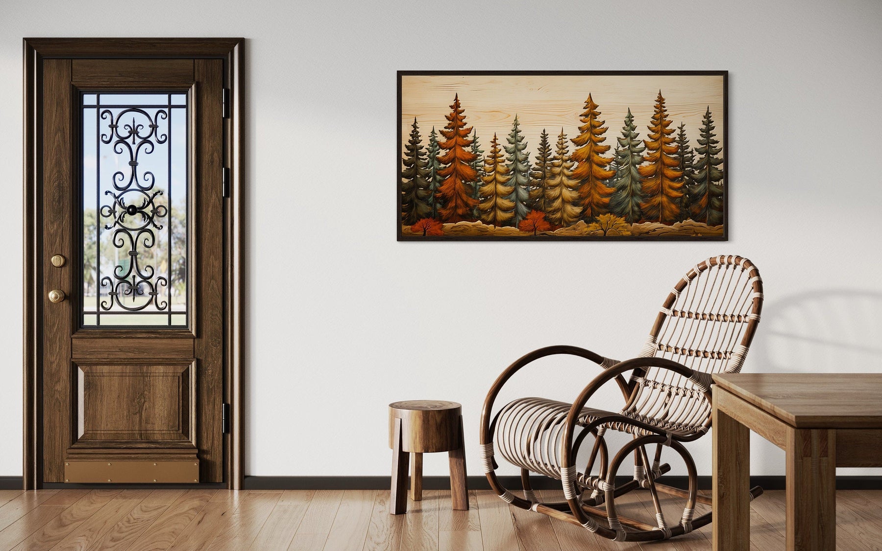 Capturez la beauté des saisons changeantes avec cette superbe décoration murale forestière, mettant en vedette une peinture de forêt de sapins d'automne sur toile. Cette œuvre d'art représente de manière vivante les riches couleurs de l'automne, avec des sapins aux teintes dorées et orange se dressant sur un paysage serein. Le fond effet bois ajoute une touche rustique, faisant de cette pièce un ajout idéal à la décoration de la cabane ou à tout espace qui célèbre la beauté naturelle de l'extérieur. Parfait pour ajouter de la chaleur et un sentiment de tranquillité à votre salon, chambre ou couloir, cette décoration murale rustique invite l'essence paisible de la forêt dans votre maison. Que vous cherchiez à améliorer votre retraite rustique ou à apporter une touche d'automne dans votre espace, cette œuvre d'art encadrée et prête à accrocher offre un lien intemporel avec la splendeur de la nature. Laissez cette peinture de forêt de sapins d'automne transformer votre maison avec ses couleurs vibrantes et sa composition sereine.
